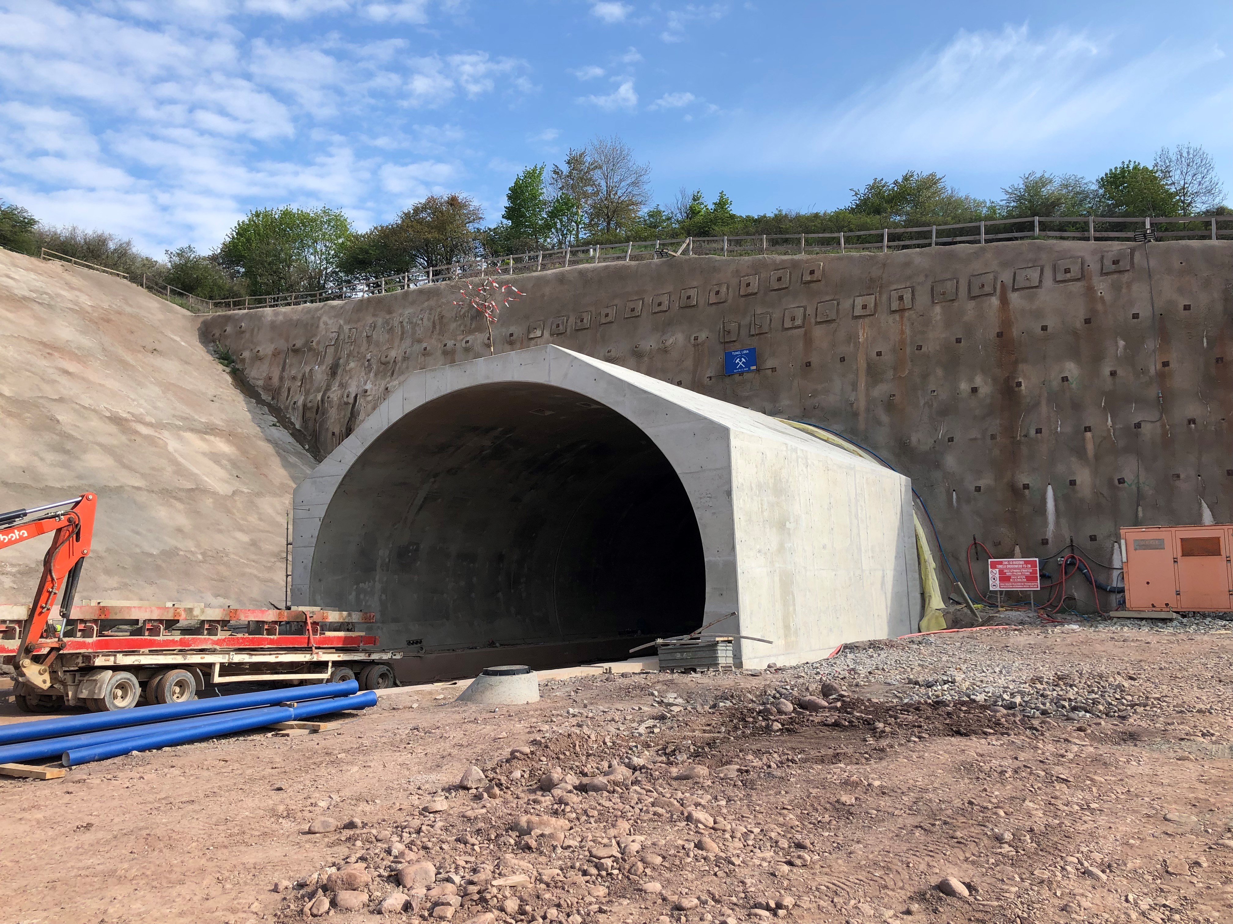Prace nad budową drogowego, dwunawowego tunelu rozpoczęły się 5 grudnia 2020 roku na portalu południowym. W pierwszej fazie, za pomocą drążenia trwa wydobycie urobku i wykonanie tzw. obudowy wstępnej. Obie nawy mają łącznie długość 4420,76 m, a do ich wydrążenia wykorzystano 385 t materiałów wybuchowych. Wyrobisko zabezpieczono 77 400 m3 torkretu. Ostatecznie przebicie nastąpiło 22 lutego 2022 roku.