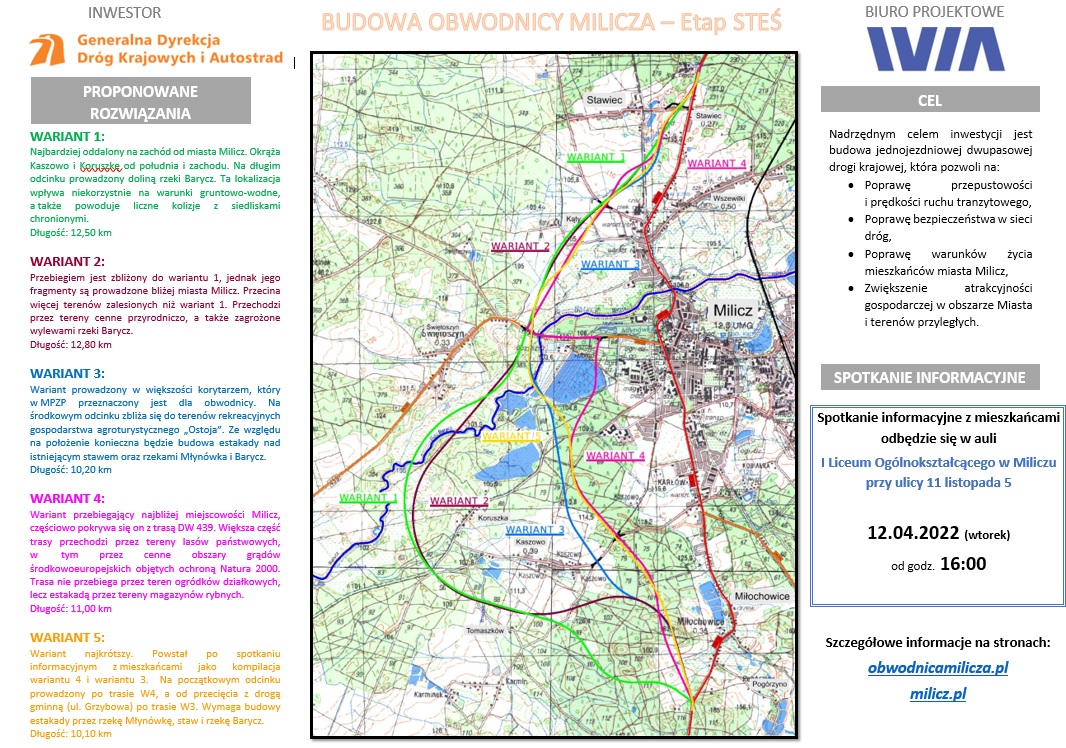 W najbliższy wtorek, 12 kwietnia, przedstawione zostaną mieszkańcom proponowane rozwiązania przebiegu wariantów projektowanej obwodnicy Milicza w ciągu drogi krajowej nr 15. Spotkanie odbędzie się w auli I Liceum Ogólnokształcącego w Miliczu przy ulicy 11 listopada 5 i rozpocznie się o godz. 16:00.