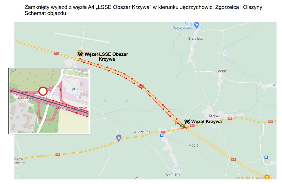 Dla jadących od strony Wrocławia, którzy będą chcieli zjechać na węźle LSSE Obszar Krzywa na drogę gminną, objazd poprowadzony będzie przez węzeł Krzyżowa do węzła Bolesławiec i z powrotem do węzła LSSE Obszar Krzywa. Objazd jest zaznaczony na RYSUNKU NR 2.