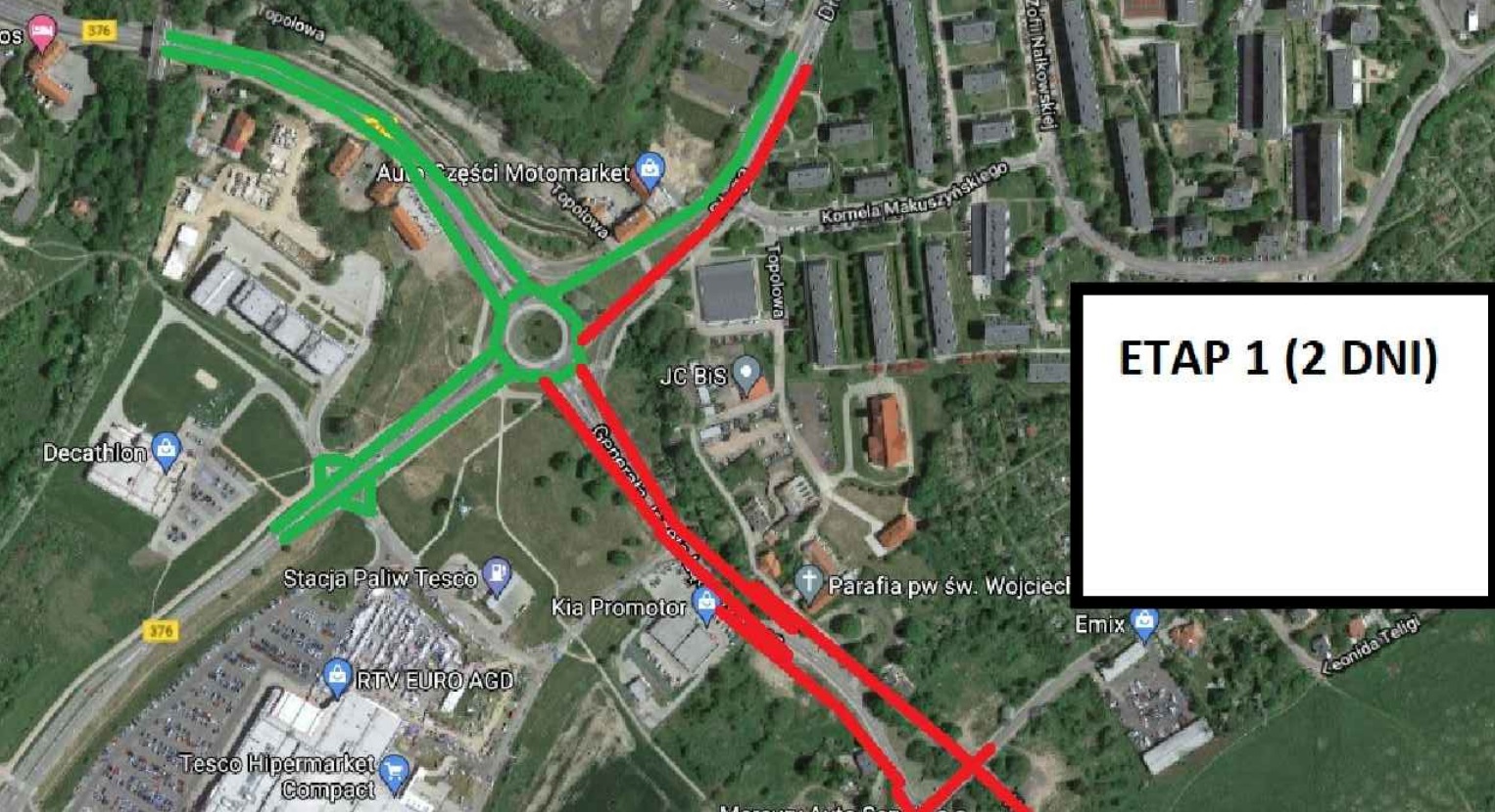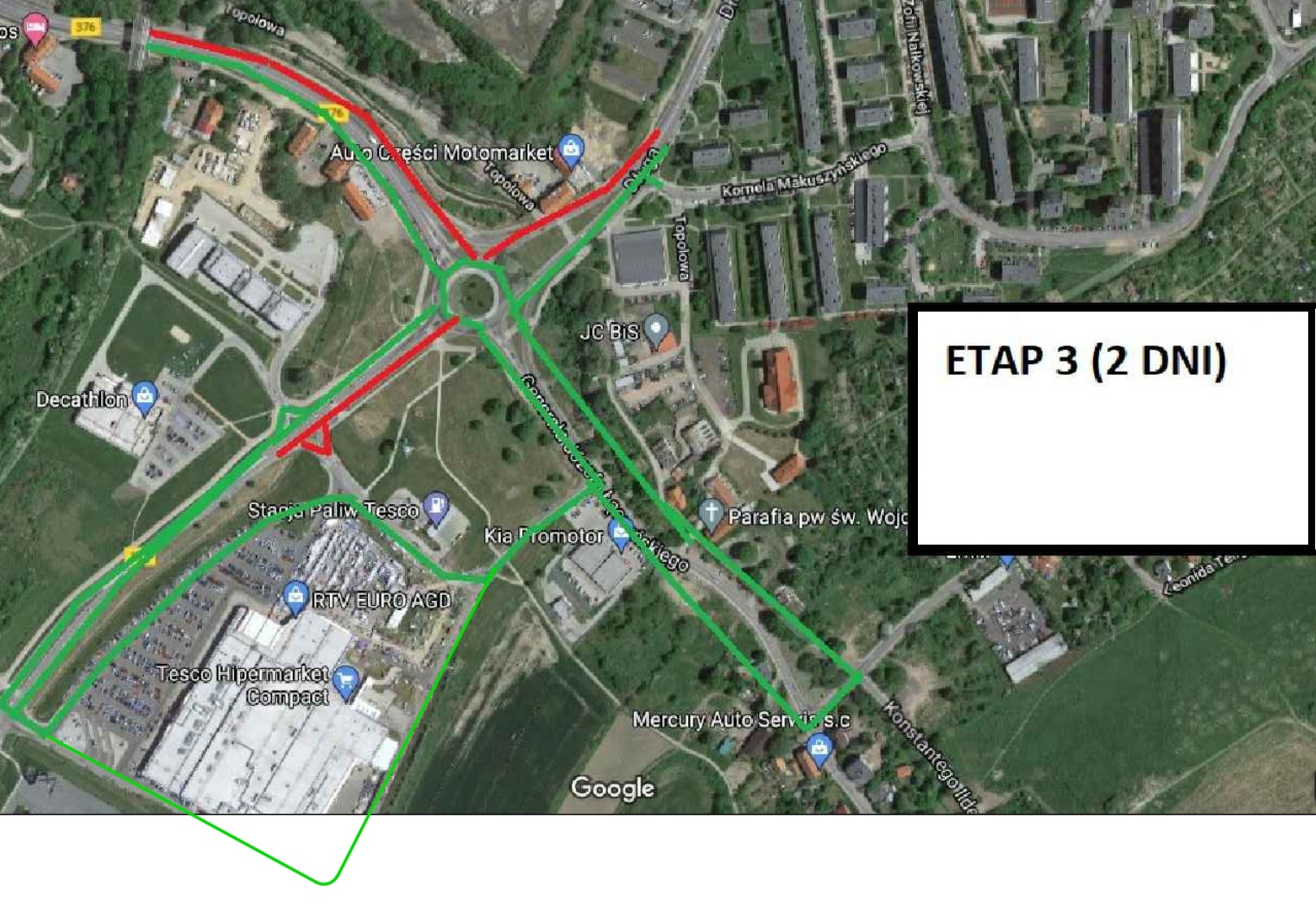 W etapie 3 zamknięte zostaną również prawa jezdnia ul. Długiej oraz lewa jezdnia wschodniego wlotu ul. Łączyńskiego. W związku z powyższym oraz w celu zapewnienia płynności ruchu przewiduje się wprowadzenie ruchu dwukierunkowego na lewej jezdni ul. Długiej oraz prawej jezdni wschodniego wlotu ul. Łączyńskiego.
