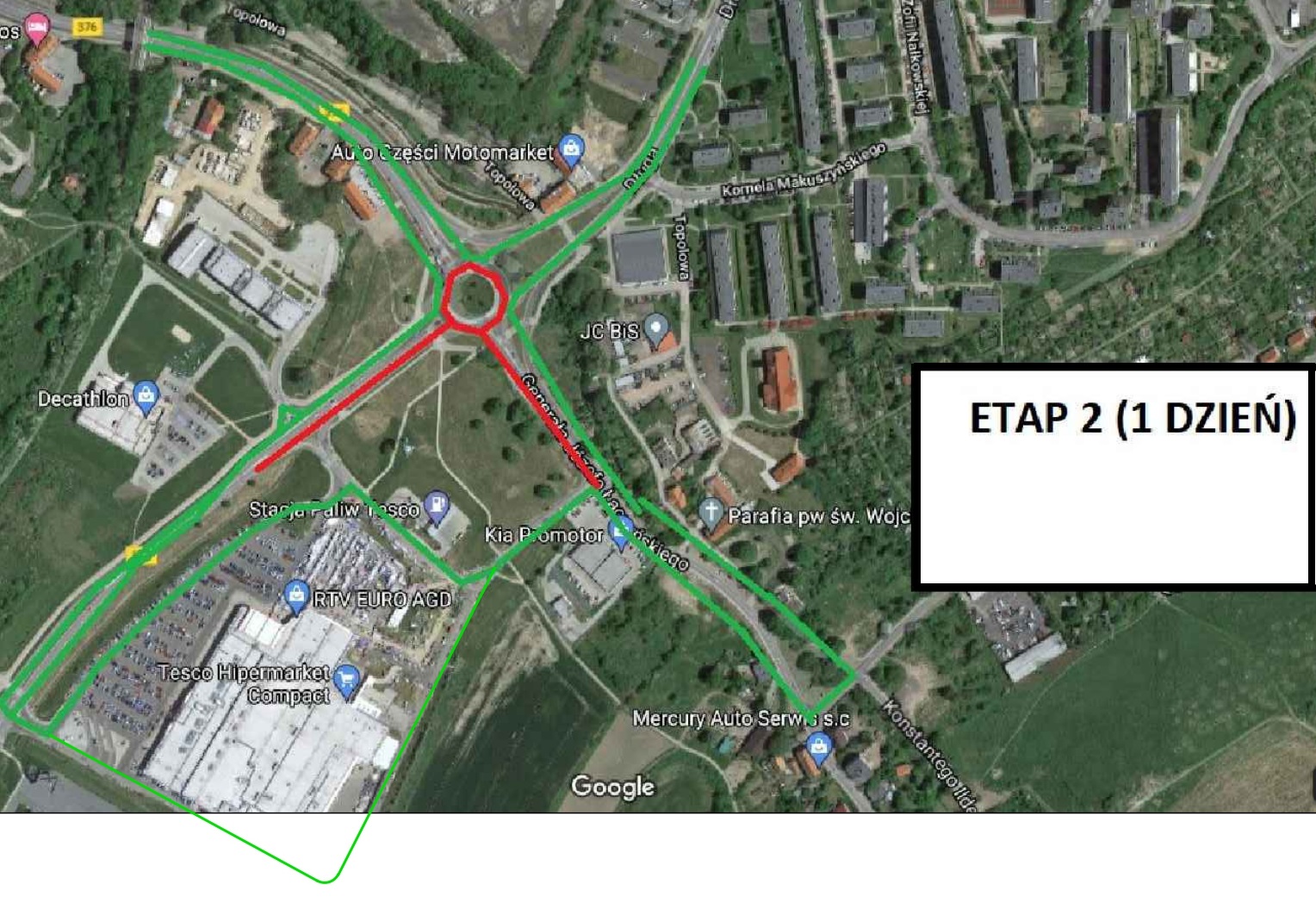 W etapie 2 planuje się zamknięcie jezdni ronda z utrzymaniem relacji prawoskrętnych oraz zamknięcie lewej jezdni zachodniego wlotu ul. Łączyńskiego oraz prawej jezdni ul. Szczawieńskiej. W związku z tym przejazd z dzielnicy Podzamcze w kierunku ul. Długiej będzie możliwy objazdem przez ul. Szczawieńską, następnie przez teren Tesco, dalej przez odcinek jednokierunkowy lewej jezdni ul. Łączyńskiego i łącznik pod estakadą ES/Z/5, a następnie, po nawrocie, prawą jezdnią ul. Łączyńskiego w kierunku ronda. Możliwe będzie również zawracanie na skrzyżowaniu ulic Długiej i Makuszyńskiego.
