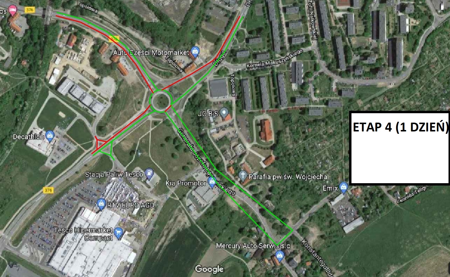 W etapie 4 planuje się zamknięcie lewej jezdni ul. Szczawieńskiej, prawej jezdni ul. Długiej oraz prawej jezdni wschodniego wlotu ul. Łączyńskiego. W związku z tym przewiduje się wprowadzenie ruchu dwukierunkowego na jezdni prawej ul. Szczawieńskiej, lewej jezdni ul. Długiej oraz lewej jezdni wschodniego wlotu ul. Łączyńskiego. W dalszym ciągu utrzymane zostaną zapory na ul. Gałczyńskiego i Chopina.