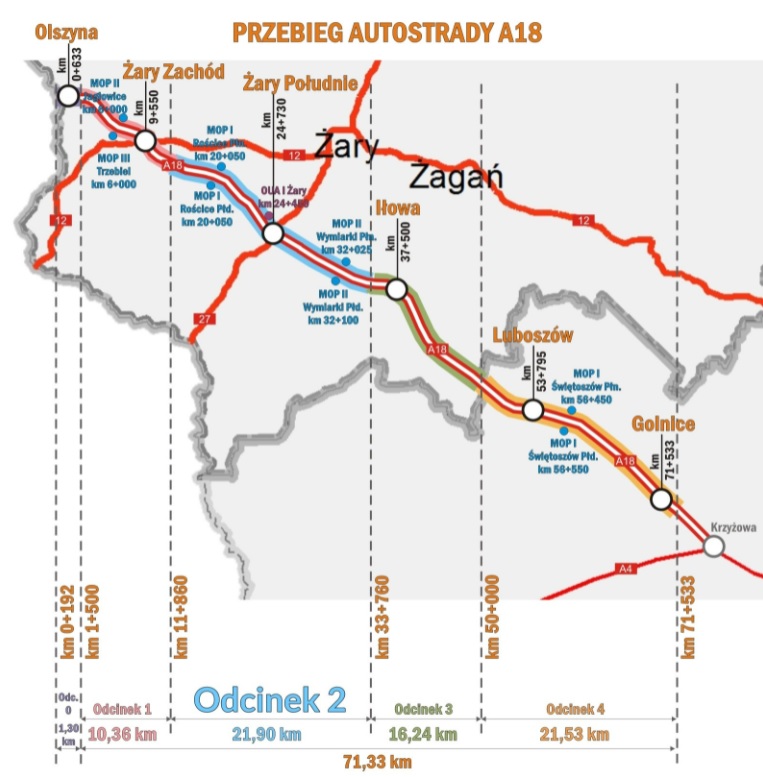 W styczniu br. podpisana została umowa na przebudowę oraz dostosowanie odcinka drogi krajowej nr 18 do parametrów autostrady. Jest to czwarty i ostatni odcinka A18 rozpoczynający się na granicy woj. lubuskiego i dolnośląskiego, a kończącego na węźle Golnice. Inwestycja przebiegająca przez Dolny Śląski realizowana jest przez GDDKiA o./Zielona Góra.