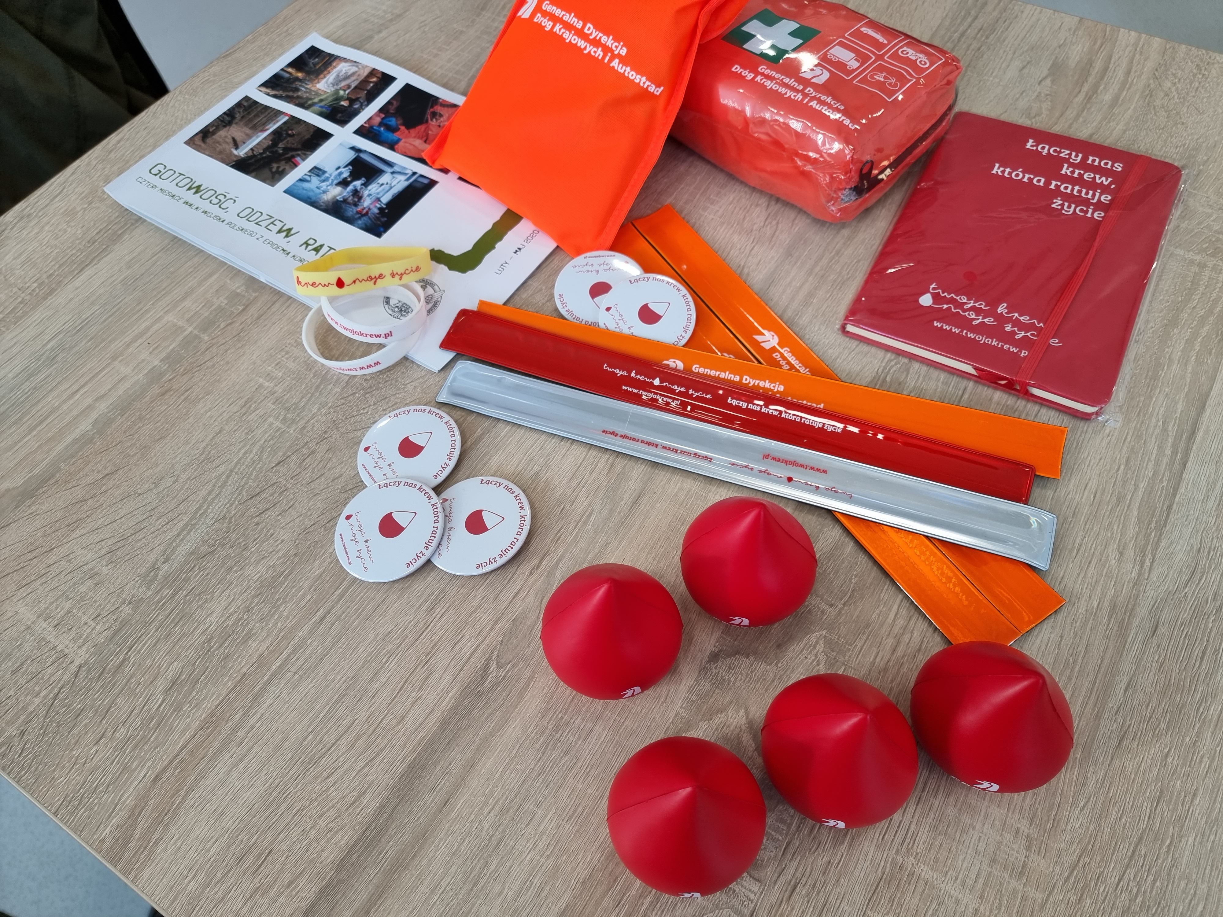 Każdy dawca, który oddał krew w WCKIK na ul. Weigla we Wrocławiu, otrzymywał drobne upominki, o które zadbała GDDKiA, Narodowe Centrum Krwi oraz Wojewódzki Fundusz Ochrony Środowiska i Gospodarki Wodnej we Wrocławiu. Dziękujemy żołnierzom z 2 kompanii regulacji ruchu z Oleśnicy za tak liczne przybycie do centrum krwiodawstwa.