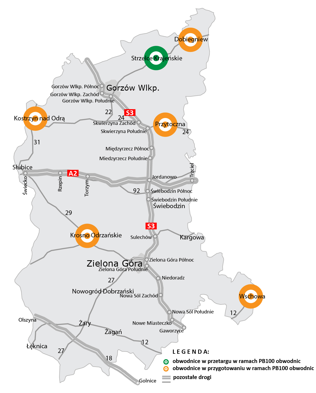 W rządowym Programie budowy 100 obwodnic na lata 2020-2030 znalazło się sześć inwestycji w województwie lubuskim. Zaplanowano je dla Dobiegniewa (DK22), Kostrzyna nad Odrą (DK31), Krosna Odrzańskiego (DK29), Przytocznej (DK24), Strzelec Krajeńskich (DK22) oraz Wschowy i Dębowej Łęki (DK12).