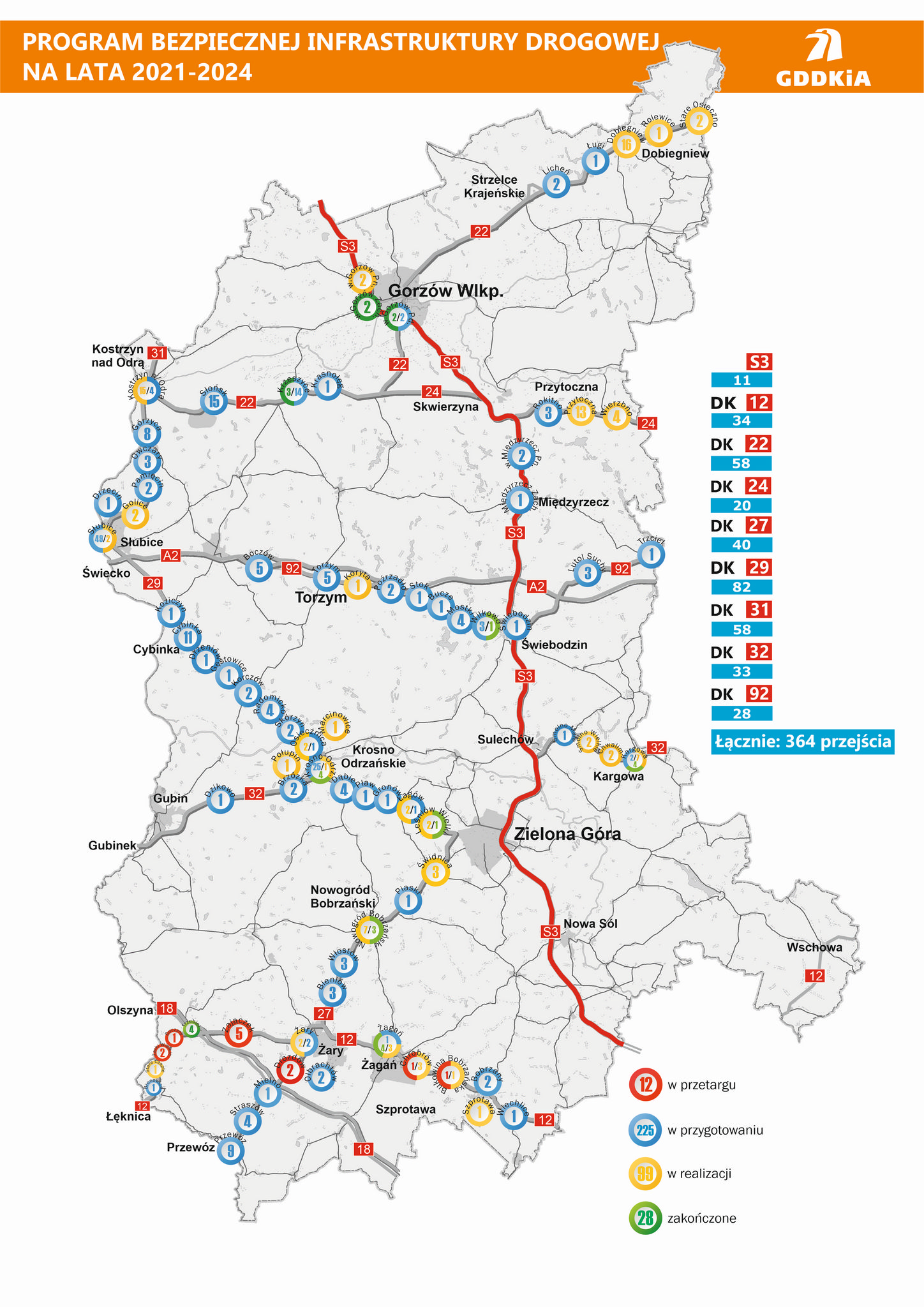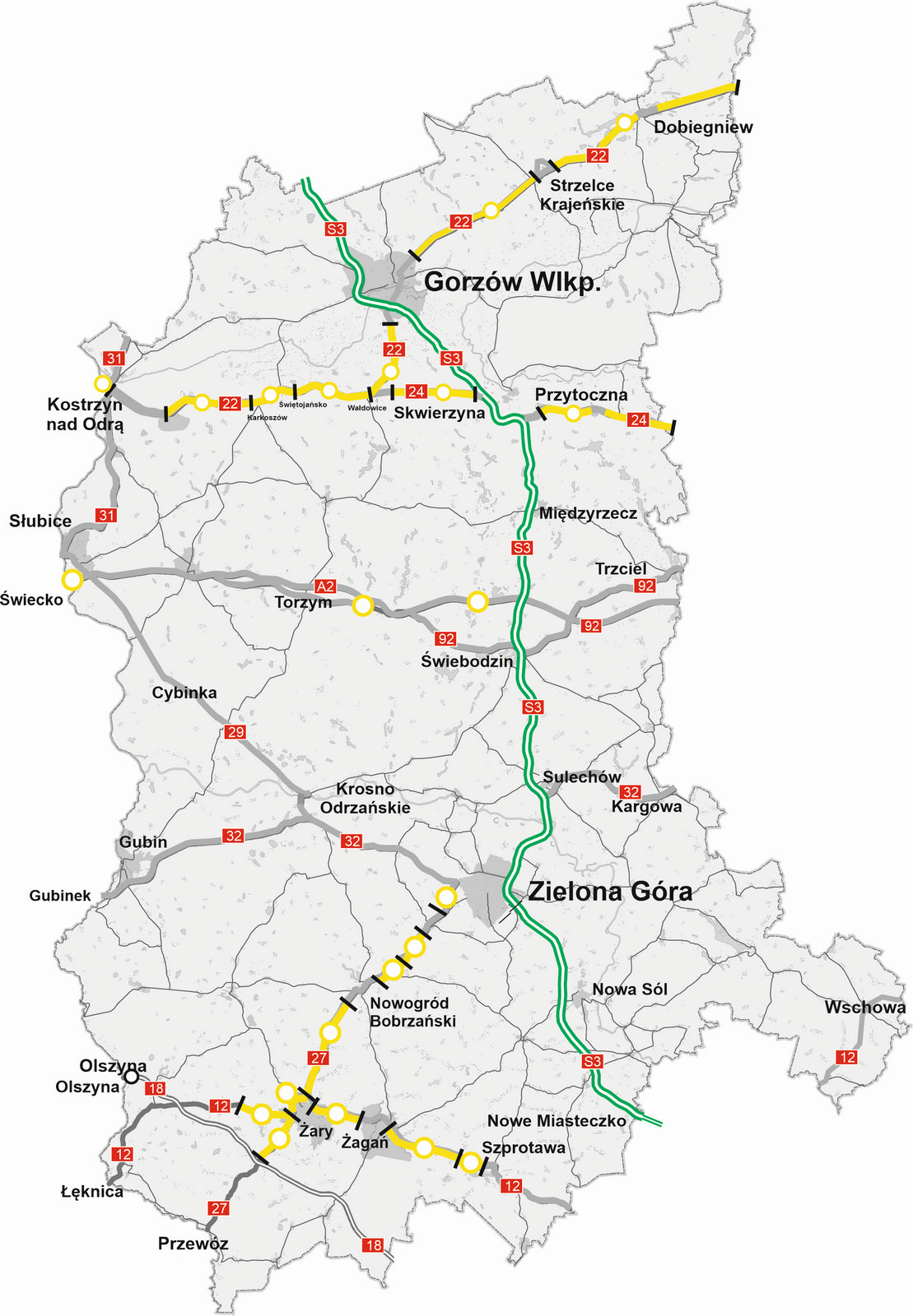 Prowadzone są prace przygotowawcze dotyczące przebudowy czterech ciągów dróg krajowych na terenie woj. lubuskiego tj. DK12, DK22, DK24 i DK27, które niemal na całej swojej długości zostaną przebudowane. Podstawowym celem inwestycji jest doprowadzenie dróg do standardu klasy GP (droga główna ruchu przyspieszonego). Oznacza to dostosowanie nośności nawierzchni do przenoszenia ruchu o obciążeniu 11,5 tony na oś, a także uzyskanie przekroju jednojezdniowego dwukierunkowego.