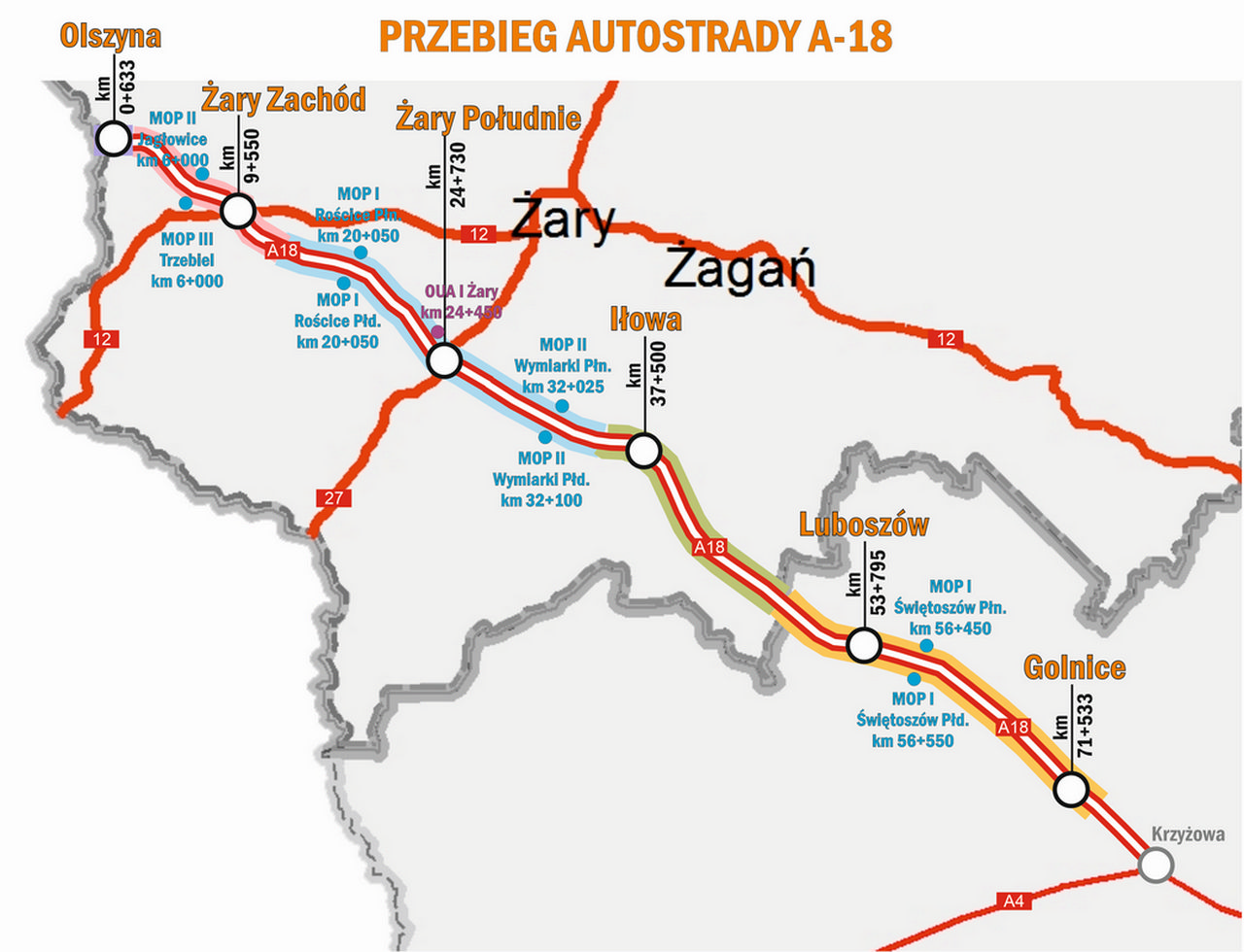 Pod koniec października ogłosiliśmy przetarg na dzierżawę MOP Wymiarki w ciągu A18 pomiędzy węzłami Żary Południe i Iłowa. Zadaniem przyszłego dzierżawcy będzie budowa pełnej infrastruktury MOP ze stacją paliw i restauracją, a następnie jego utrzymanie i obsługa podróżnych. Umowa zostanie zawarta na okres dwudziestu lat.