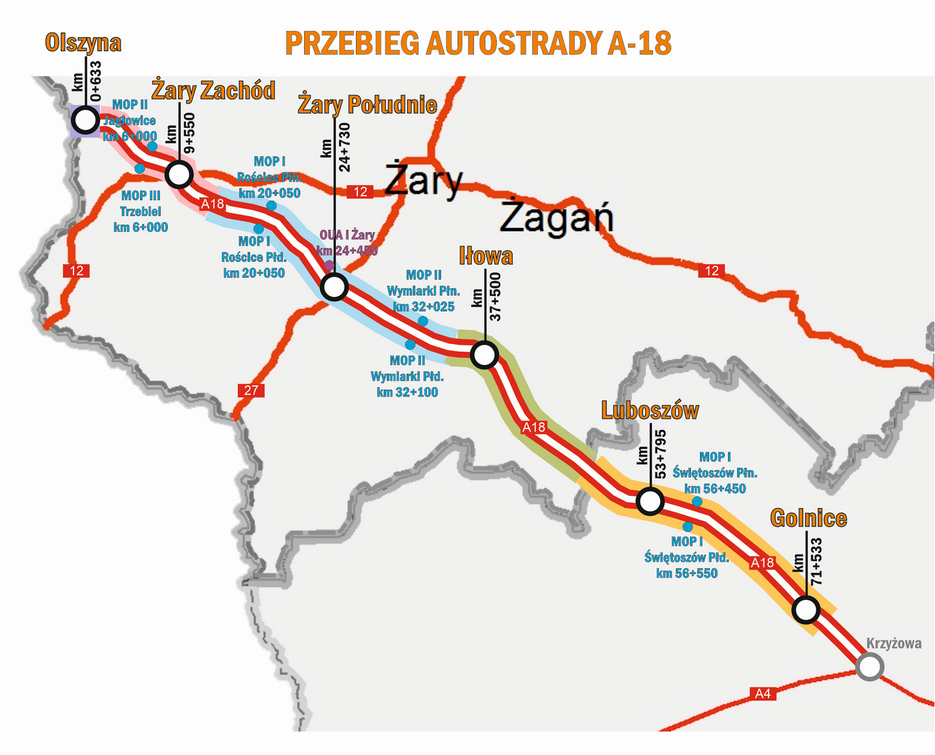 Mamy już kompletną sieć dróg szybkiego ruchu w naszym województwie, na którą składają się drogi A2, A18 i S3. Osiągnęliśmy to dzięki oddaniu do ruchu w drugiej połowie bieżącego roku przebudowanych 50 km dawnej drogi DK18 na odcinkach Olszyna – Żary Zachód i Iłowa – Golnice. Była to część drugiego etapu budowy autostrady A18, polegającego na przebudowie jezdni południowej drogi DK18 i dostosowanie, w pełnym zakresie, istniejącego układu drogowego do parametrów autostrady. Wymieniona została stara nawierzchnia betonowa południowej jezdni (w kierunku Wrocławia), wybudowane zostały dodatkowe górne przejścia dla dużych zwierząt, wiadukty i mosty w ciągu autostrady. Przebudowane zostały także węzły drogowe. Wartość robót budowalnych wykonanych na całym odcinku o długości 70 km to ponad 900 mln zł.