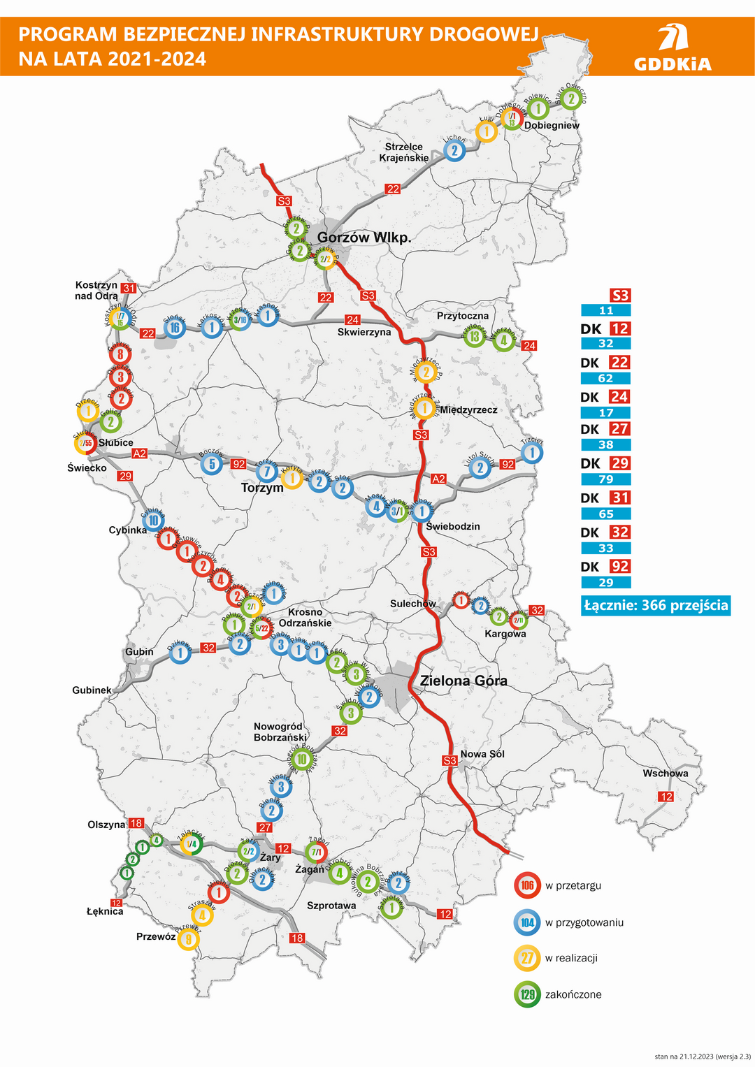 sto trzydzieści zadań w woj. lubuskim zostało zakończonych, a dwadzieścia siedem jest w trakcie realizacji. Na etapie procedury przetargowej jest obecnie sto sześć zadań i ponad sto kolejnych w przygotowaniu. Poprawa bezpieczeństwa na przejściach dla pieszych to jedno z podstawowych założeń programu.