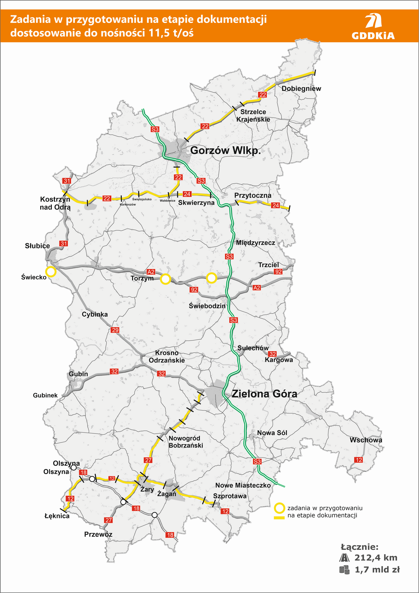 Prowadzone są prace przygotowawcze dotyczące przebudowy czterech ciągów dróg krajowych na terenie woj. lubuskiego tj. DK12, DK22, DK24 i DK27, które niemal na całej swojej długości zostaną przebudowane. Podstawowym celem inwestycji jest doprowadzenie dróg do standardu klasy GP (droga główna ruchu przyspieszonego). Oznacza to dostosowanie nośności nawierzchni do przenoszenia ruchu o obciążeniu 11,5 tony na oś, a także uzyskanie przekroju jednojezdniowego dwukierunkowego.