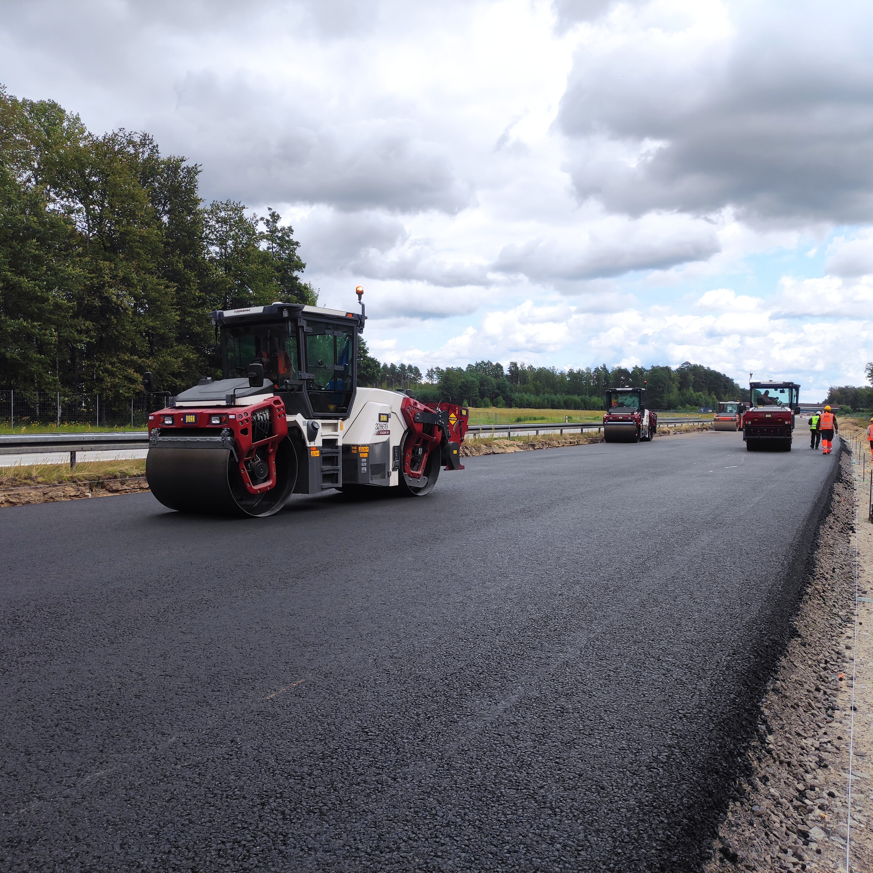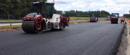 Na zdjęciu widać świeżo ułożoną mieszankę mineralno-asfaltową i 4 walce drogowe zagęszczające masę. Obok jednego walca pracujący robotnicy. W oddali widać las.