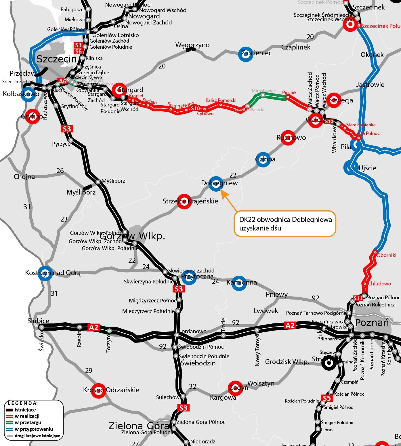 - Strzelec Krajeńskich w ciągu DK22 oraz Krosna Odrzańskiego w ciągu DK29, które są już na etapie realizacji,