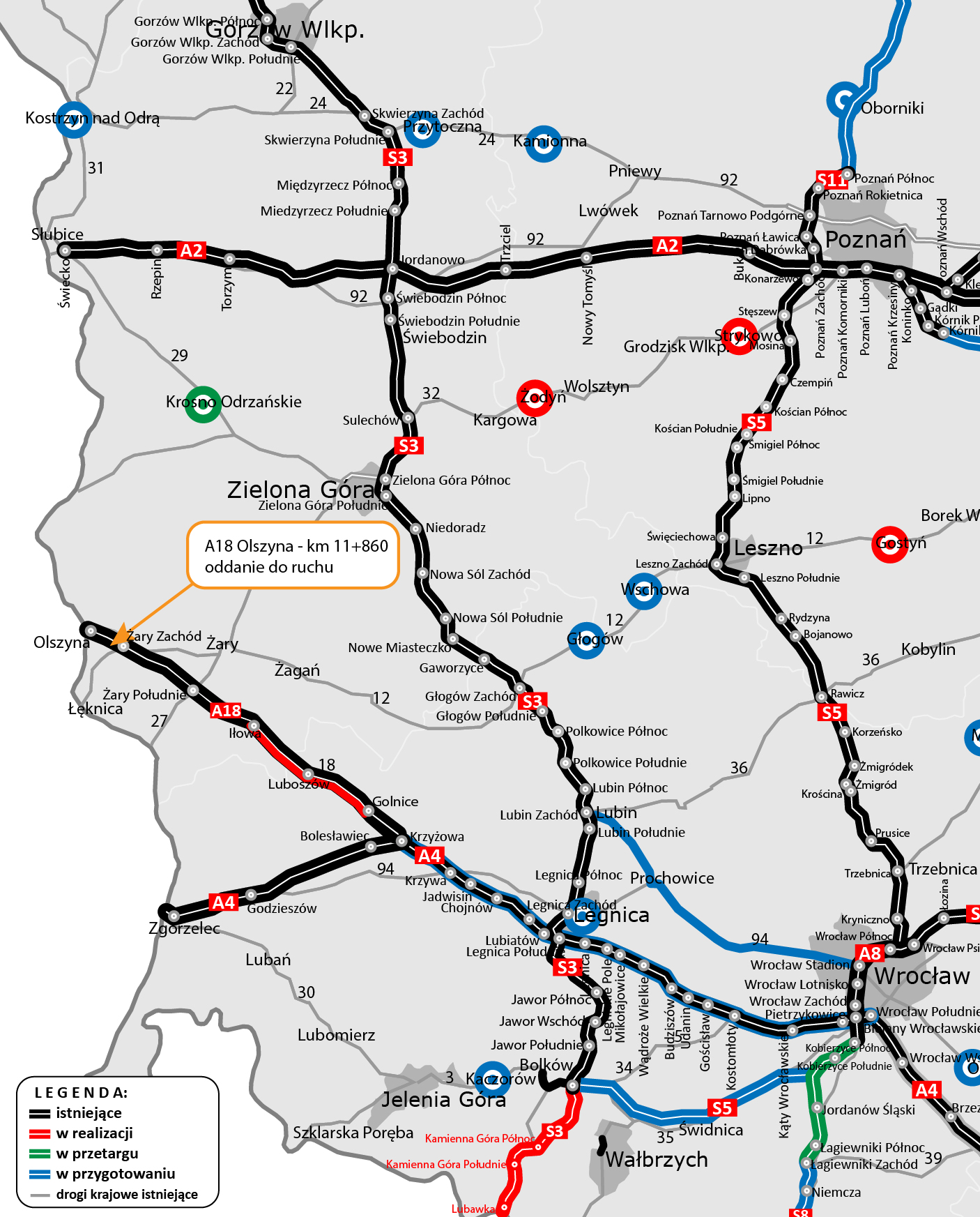 Otrzymaliśmy pozwolenie na użytkowanie rozbudowanego do parametrów autostrady dawnego odcinka DK18. Odcinek zaczyna się sto pięćdziesiąt metrów za węzłem Olszyna, a kończy się ok. dwa kilometry za węzłem Żary Zachód. To 11 km komfortowej autostrady wykonanej w technologii asfaltowej.