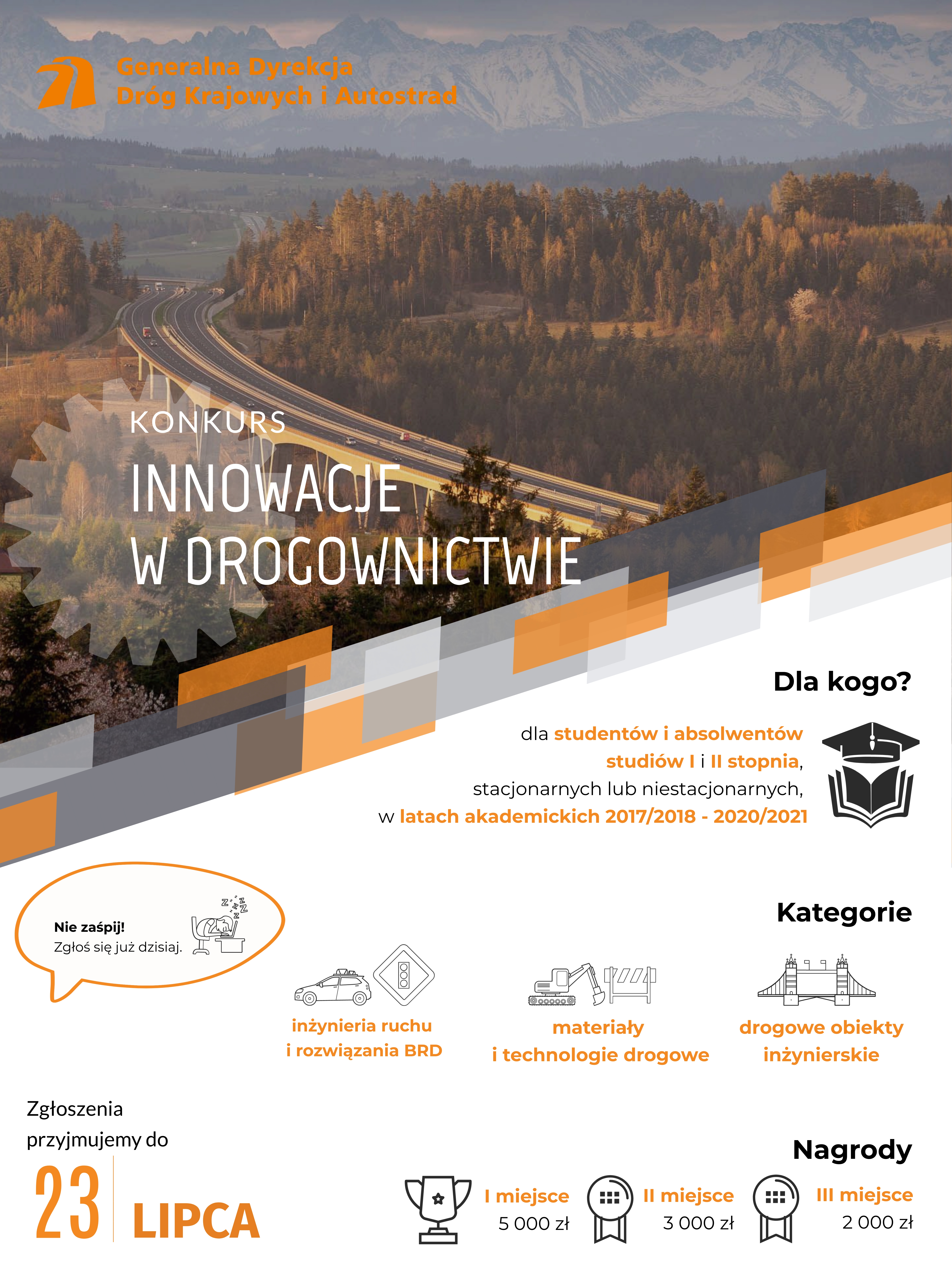 Chcąc wykorzystać potencjał polskich uczelni technicznych, Generalny Dyrektor Dróg Krajowych i Autostrad ogłasza I edycję Konkursu pod nazwą Innowacje w drogownictwie. Konkurs adresowany jest do studentów bądź absolwentów studiów pierwszego i drugiego stopnia, stacjonarnych lub niestacjonarnych w latach akademickich 2017/2018 - 2020/2021. Celem Konkursu jest wyłonienie najlepszych prac dyplomowych (magisterskich, inżynierskich, licencjackich), których wyniki mogą być zastosowane w drogownictwie. To również promowanie idei przedsiębiorczości i innowacyjności wśród społeczności akademickiej.