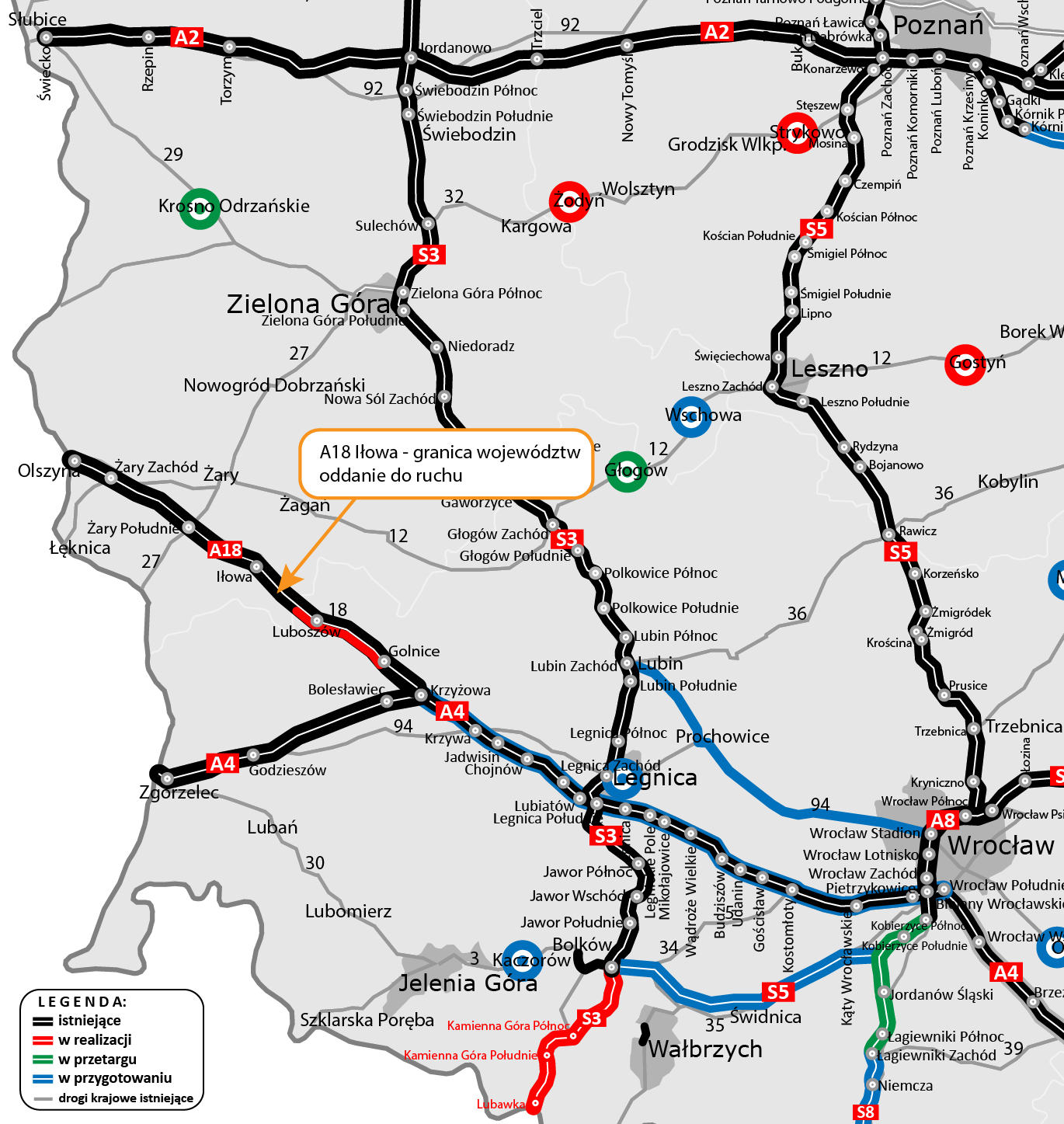 Starą drogę krajową nr 18, a obecnie jej nitkę południową, wybudowali Niemcy w latach 30. XX wieku. Stanowiła ona fragment autostrady Berlin – Wrocław. I właśnie tą jezdnię sukcesywnie oddajemy po przeprowadzonej modernizacji jako pełnoprawną autostradę.