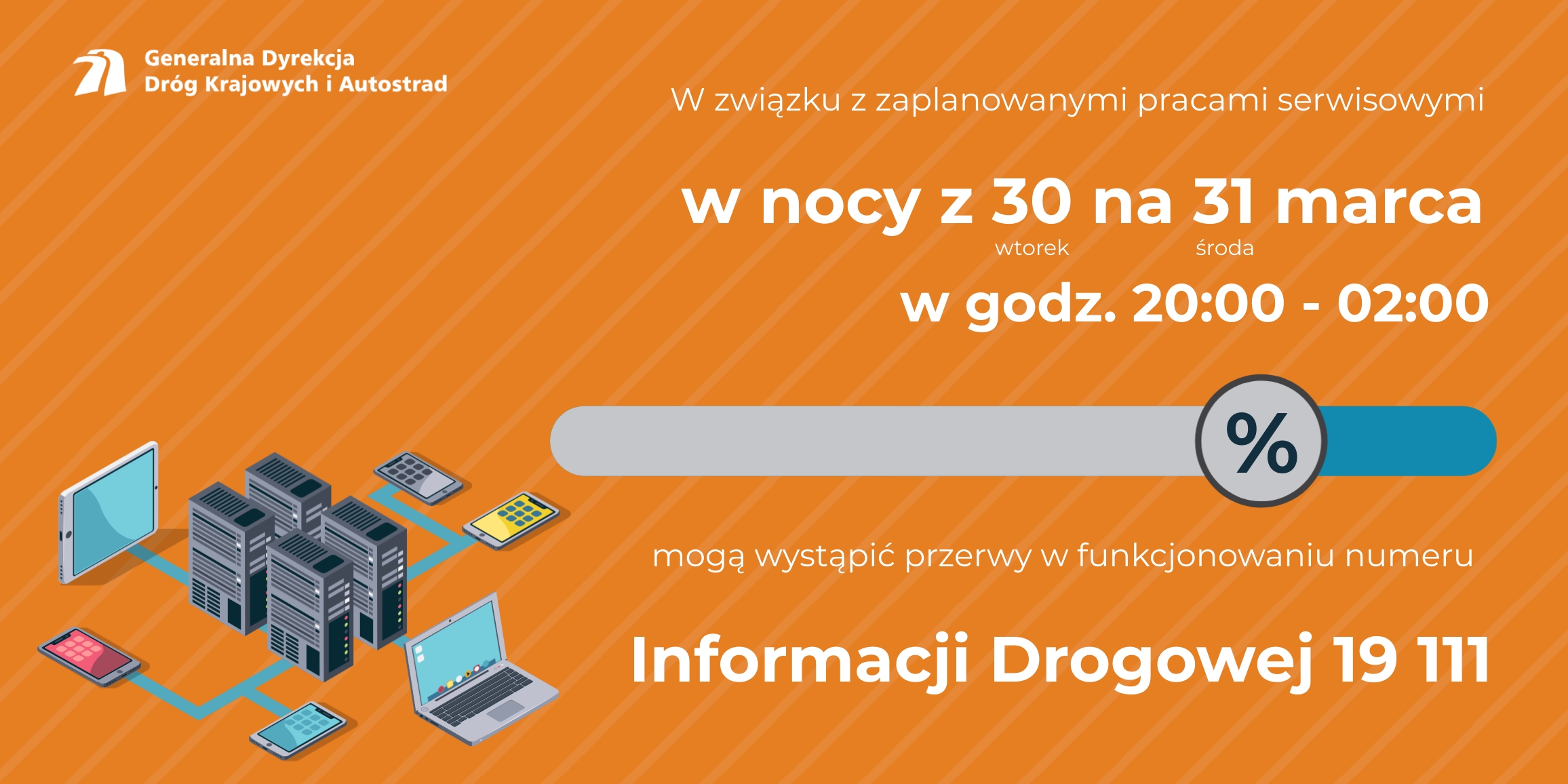 W związku z planowanymi na noc z wtorku na środę (30-31 marca) pracami serwisowymi związanymi z modernizacją usługi 19 111, informujemy, że w godz. 20:00 – 2:00 mogą nastąpić czasowe przerwy w funkcjonowaniu numeru Informacji Drogowej 19 111.
