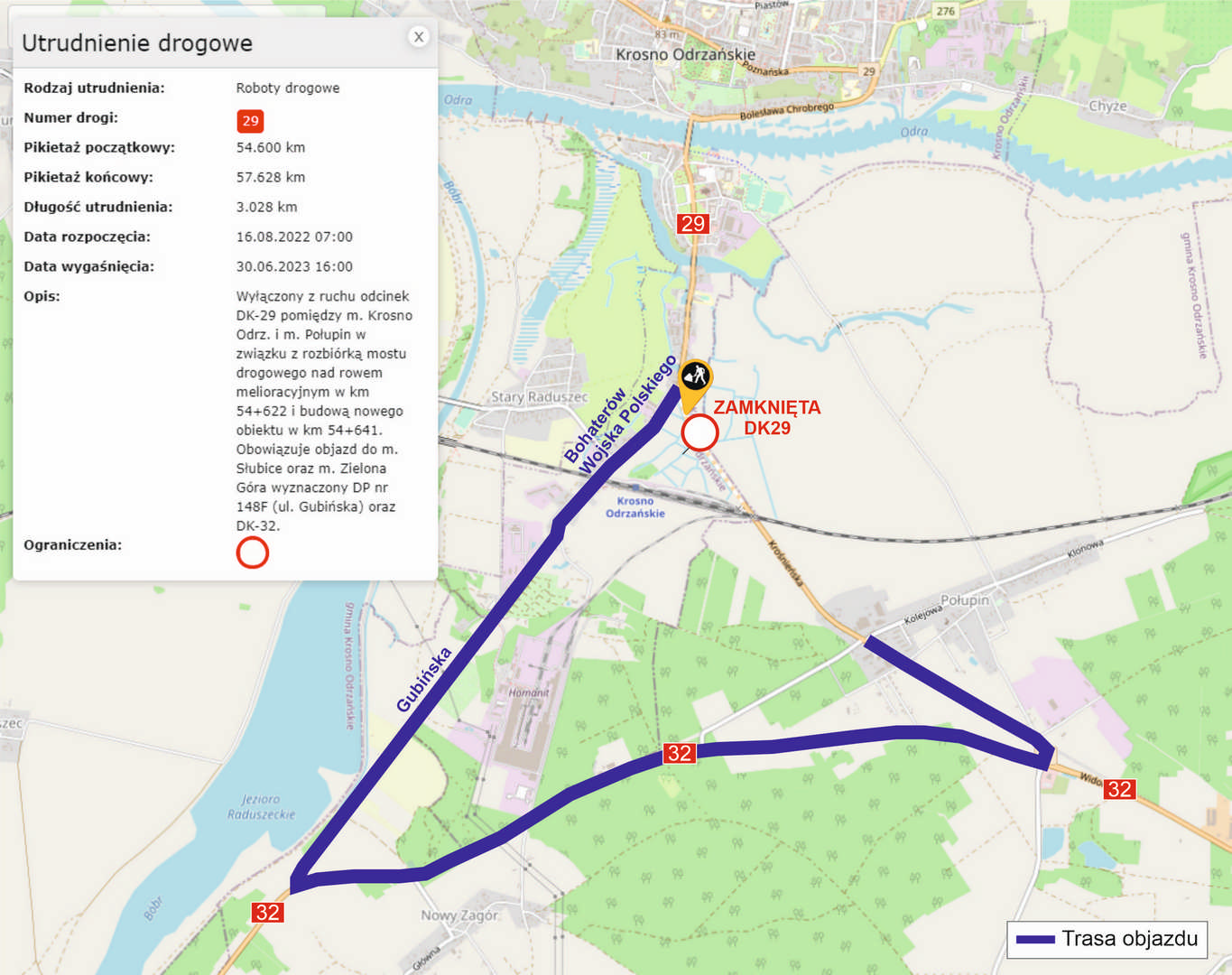 W związku z prowadzonymi pracami związanymi z przebudową mostu drogowego wyłączony z ruchu został odcinek drogi DK29 pomiędzy Krosnem Odrzańskim i Połupinem - wprowadzono objazd. Utrudnienia potrwają do czerwca przyszłego roku.