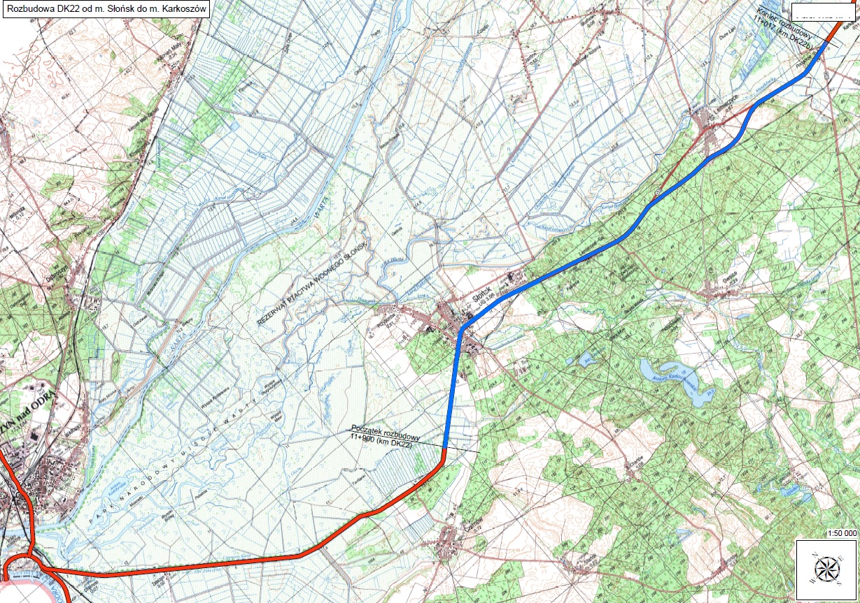 Ogłosiliśmy przetarg na wykonanie kompleksowej dokumentacji technicznej dla rozbudowy odcinka DK22 Słońsk - Karkoszów, o długości blisko 14 km. Oferty można składać do 4 kwietnia br.