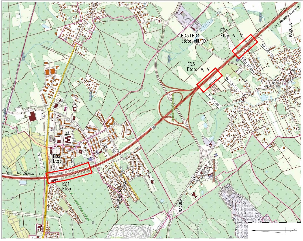 W pierwszej kolejności wykonawca przystąpi do prac przy budowie ekranu na wysokości Zielonej Góry Raculi pomiędzy węzłami Zielona Góra Południe i Niedoradz, na jezdni w kierunku południowym. W związku z rozpoczęciem prac wprowadzone zostanie ograniczenie w ruchu w postaci zwężenia jezdni do jednego pasa ruchu oraz ograniczenia prędkości do 60 km/h. Lokalizacja prowadzonych robót, a tym samym utrudnień w ruchu, będzie się zmieniać w zależności od miejsca prowadzonych prac (patrz mapa).