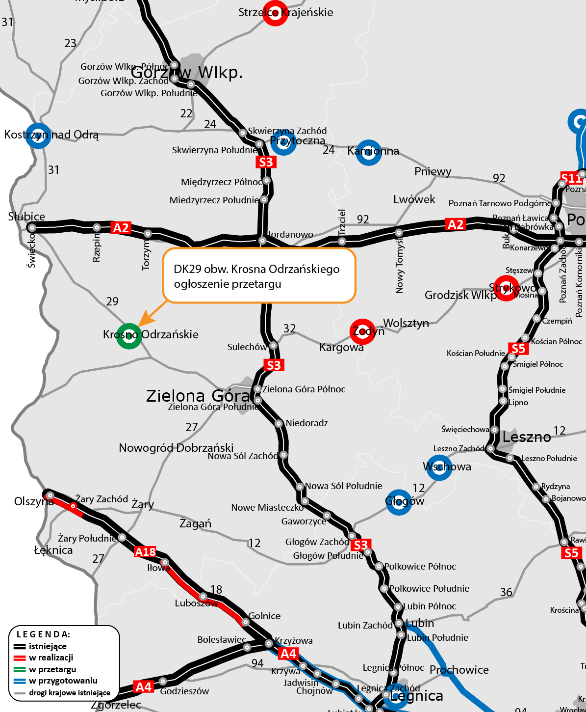 - Kostrzyna nad Odrą w ciągu DK31, Przytocznej w ciągu DK24, Wschowy i Dębowej Łęki w ciągu DK12 i Dobiegniewa w ciągu DK22, które są obecnie w fazie opracowywania Studium techniczno-ekonomiczno-środowiskowego z elementami Koncepcji Programowej na etapie procedury zmierzającej do wydania DŚU.