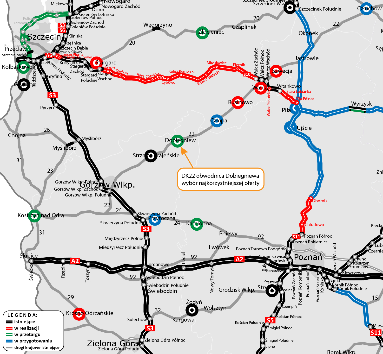 Inwestycja polega na realizacji, w nowym śladzie, obwodnicy miejscowości Dobiegniew w ciągu DK22 o długości 5,8 km. Powstanie ona w systemie Projektuj i buduj. To oznacza, że zadaniem wyłonionego w przetargu wykonawcy będzie, w pierwszej kolejności, opracowanie projektu i uzyskanie decyzji o zezwoleniu na realizację inwestycji drogowej (ZRID), a następnie wybudowanie nowej drogi. W ramach zadania zaplanowaliśmy cztery skrzyżowania z istniejącymi drogami, dwa wiadukty drogowe i jeden kolejowy oraz most nad Mierzęcką Strugą.
