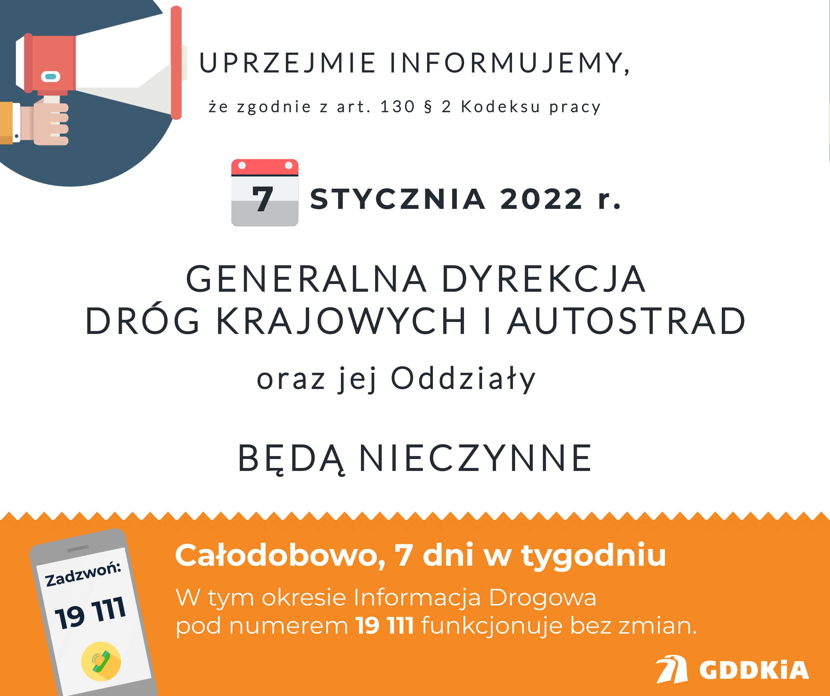 Informujemy, że zgodnie z art. 130 §2 Kodeksu pracy, 7 stycznia 2022 r. będzie dniem wolnym od pracy w Generalnej Dyrekcji Dróg Krajowych i Autostrad. Tego dnia zamknięte będą centrala, oddziały oraz rejony GDDKiA.