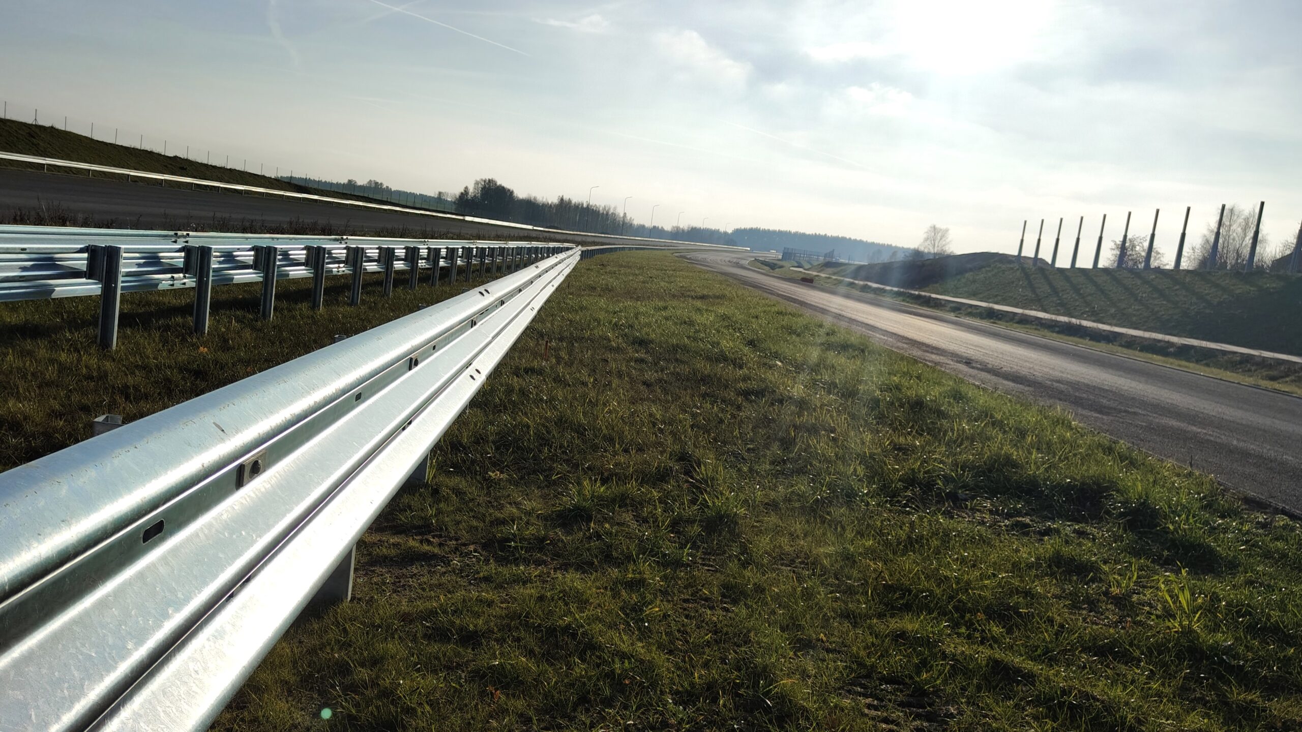 Fragment drogi z barierkami ochronnymi po lewej stronie. Barierki są metalowe, błyszczące i ciągną się wzdłuż drogi, która zakręca w oddali. Po prawej stronie drogi znajduje się trawiasty pas zieleni. W tle widać drzewa i słupy, a niebo jest jasne z lekkim zachmurzeniem. Przez chmury przebijają promienie słoneczne padając na obiektyw.