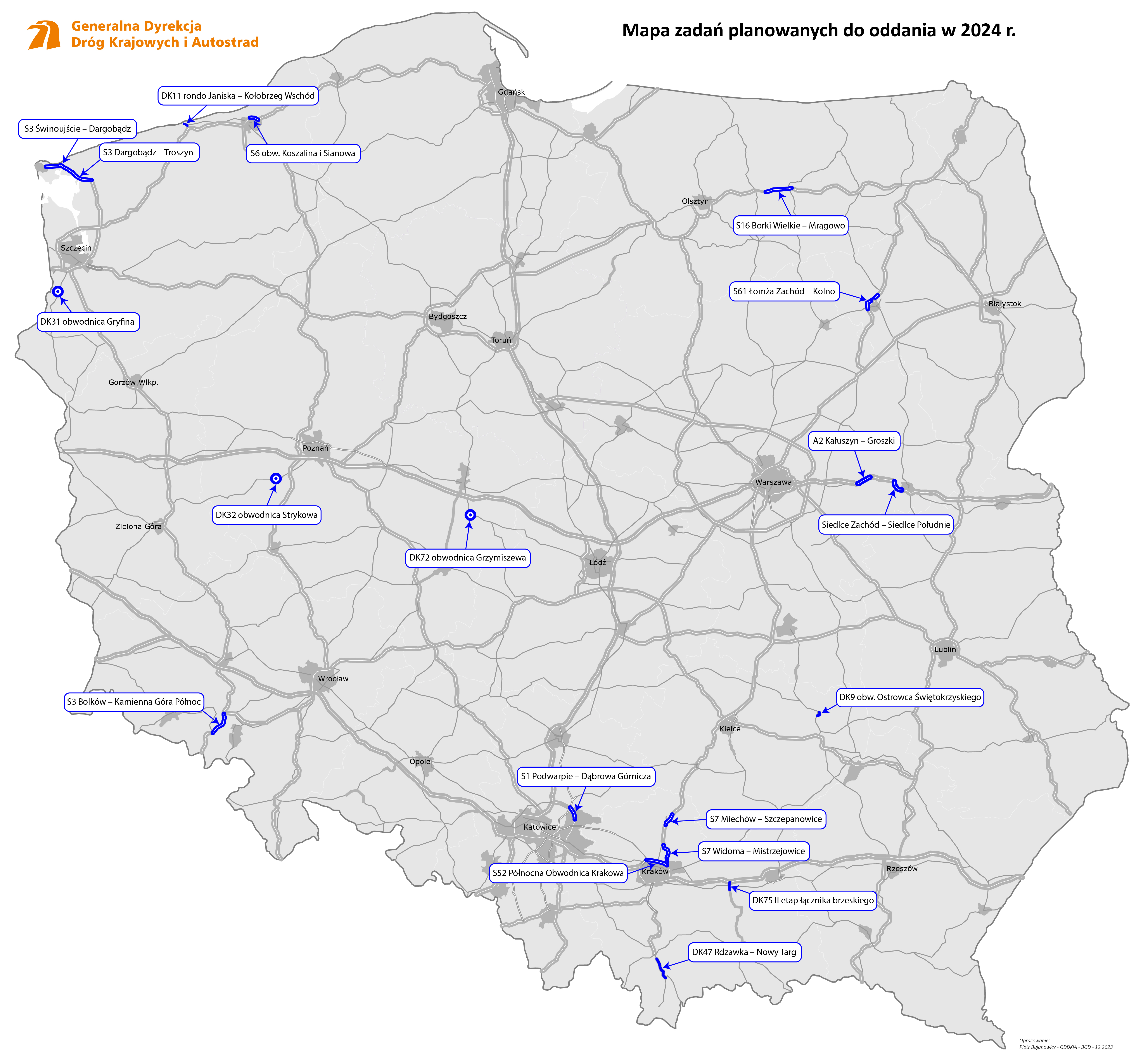 Przypomnijmy, że obecnie kierowcy mają do dyspozycji 5115,6 km dróg szybkiego ruchu, w tym 1849,2 km autostrad i 3266,4 km dróg ekspresowych. W realizacji mamy 103 zadania (PBDK, PB100 oraz dwa zadania spoza PBDK) o łącznej długości 1301 km. W postępowaniach przetargowych są obecnie 32 zadania o łącznej długości 417,9 km z Programu Budowy Dróg Krajowych (PBDK) oraz siedem obwodnic o długości 54,1 km z rządowego Programu budowy 100 obwodnic na lata 2020-2030 (PB100).