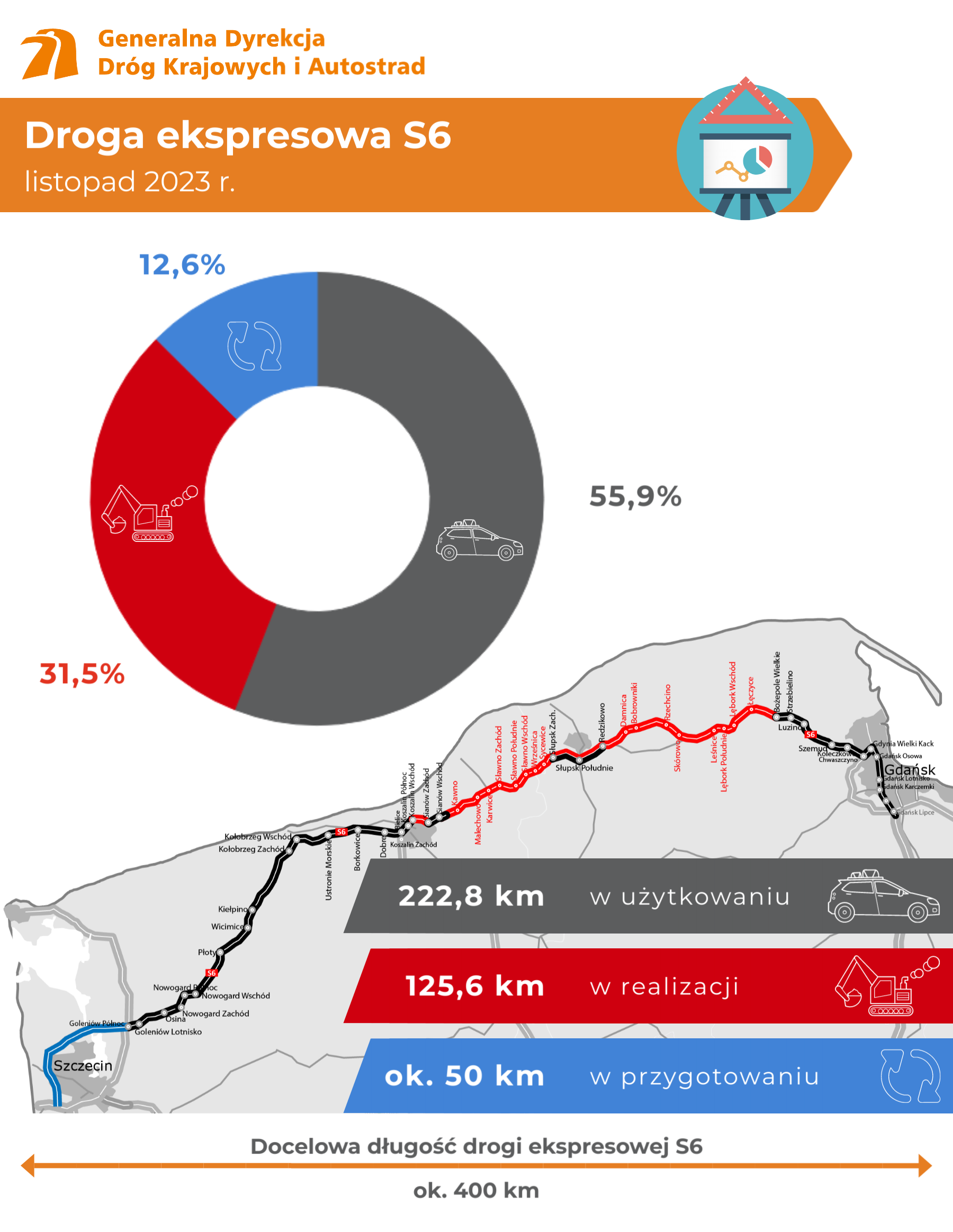 Kierowcy mają już do dyspozycji ponad 220 km tej trasy, od Goleniowa do Koszalina i od Beżepola Wielkiego do Rusocina. W realizacji jest ok. 125 km, z czego na blisko 10 km do istniejącej obwodnicy Słupska dobudowujemy drugą jezdnię, a pozostała część powstaje w pełnym dwujezdniowym przekroju. Łączny koszt realizacji tych odcinków to ponad 3,8 mld zł. Uwzględniając budowę Obwodnicy Metropolii Trójmiejskiej to długość realizowanych dróg ekspresowych na Pomorzu wzrośnie o ok. 32 km, a łączna wartość inwestycji o kolejne 1,5 mld zł. W przygotowaniu mamy ok. 50 km Zachodniej Obwodnicy Szczecina.