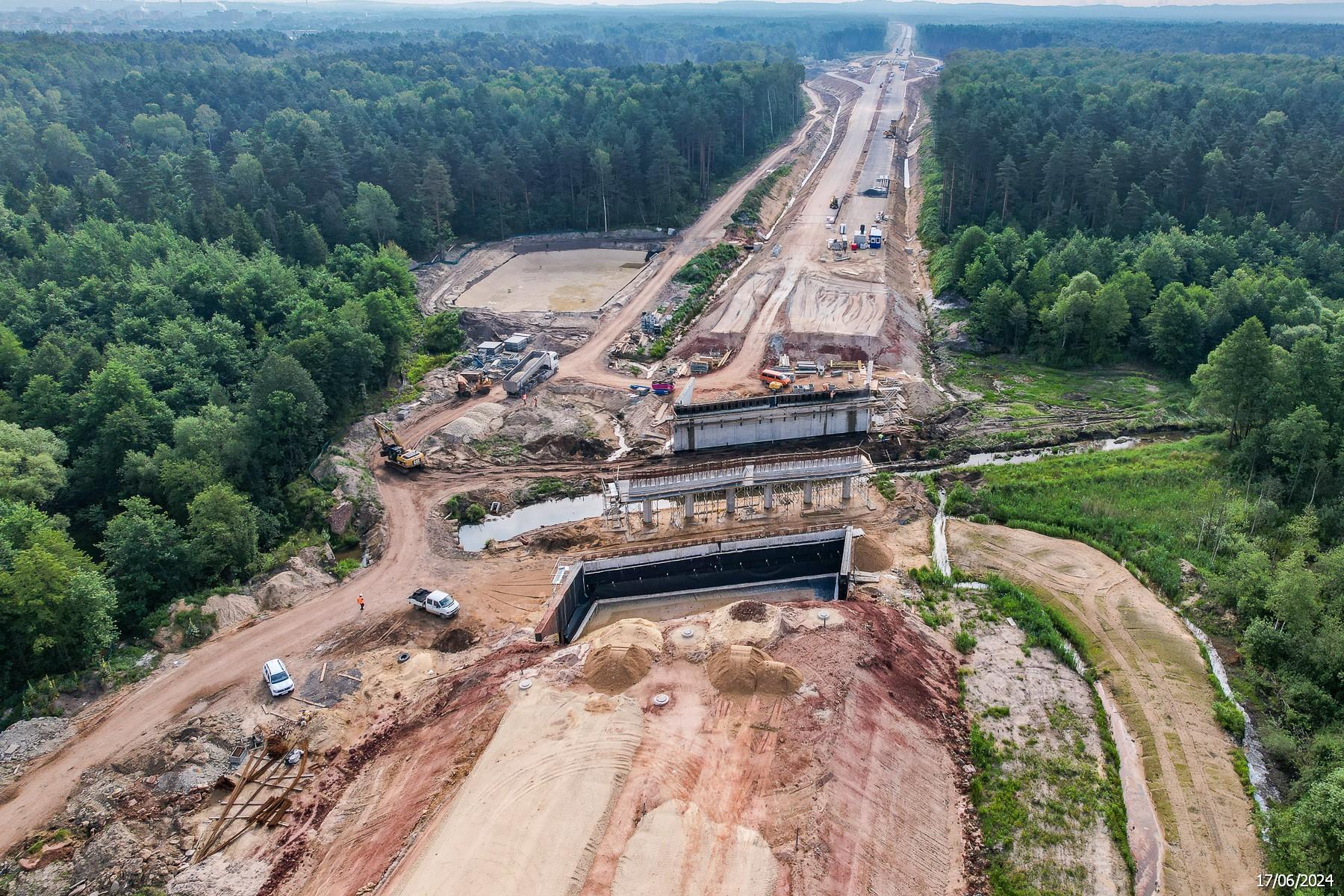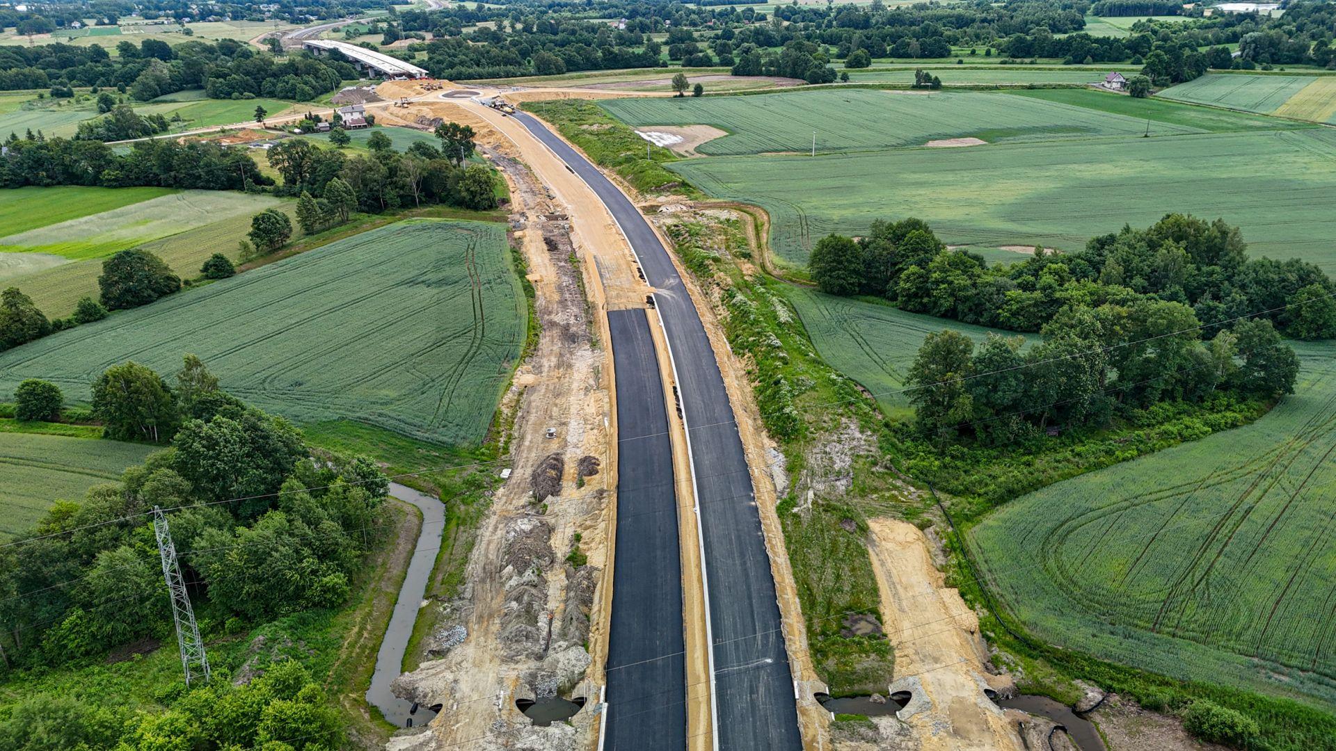 W ramach inwestycji powstaje dwujezdniowa droga klasy GP (główna ruchu przyspieszonego). Wykonawca jest bliski dokończenia robót ziemnych, wykonywania podbudów z kruszyw mineralnych oraz kolejnych warstw z mieszanek asfaltowych. Zaawansowanie wykonania nasypów dla całej budowy wynosi 97 proc. Zakończono wykonywanie wykopu w ciągu trasy głównej. Kontynuowane są roboty związane z wykonywaniem dolnych i górnych warstw podbudowy jezdni z kruszyw mineralnych. Zaawansowanie w tym asortymencie robót wynosi prawie 80 proc. Postępują również roboty przy wykonywaniu warstw z mieszanek asfaltowych. W ciągu trasy głównej wykonanie warstwy podbudowy asfaltowej jest zaawansowane na poziomie 70 proc. a warstwy wiążącej na poziomie 55 proc. Wykonawca kontynuuje również roboty w zakresie humusowania i obsiania skarp nasypów i wykopów oraz porządkowania terenów zielonych w pasie drogowym. Zaawansowanie robót w tym zakresie wynosi 18 proc. Równolegle są prowadzone roboty związane z odwodnieniem pasa drogowego, tj. budową zbiorników retencyjnych, kanałów hydrotechnicznych, przebudową i konserwacją przyległych rowów melioracyjnych oraz umocnienia cieków wodnych w obrębie pasa drogowego. Kontynuowane są także roboty na wszystkich obiektach mostowych. Ustroje nośne zostały wykonane na dwunastu obiektach mostowych, a zaawansowanie prac w tym obszarze wynosi 73 proc. Postępują również roboty przy obiektach służących zapewnieniu migracji zwierząt pod obwodnicą, które osiągnęły poziom 85 proc. całego zakresu. Wykonanych zostało 29 przepustów ekologicznych.