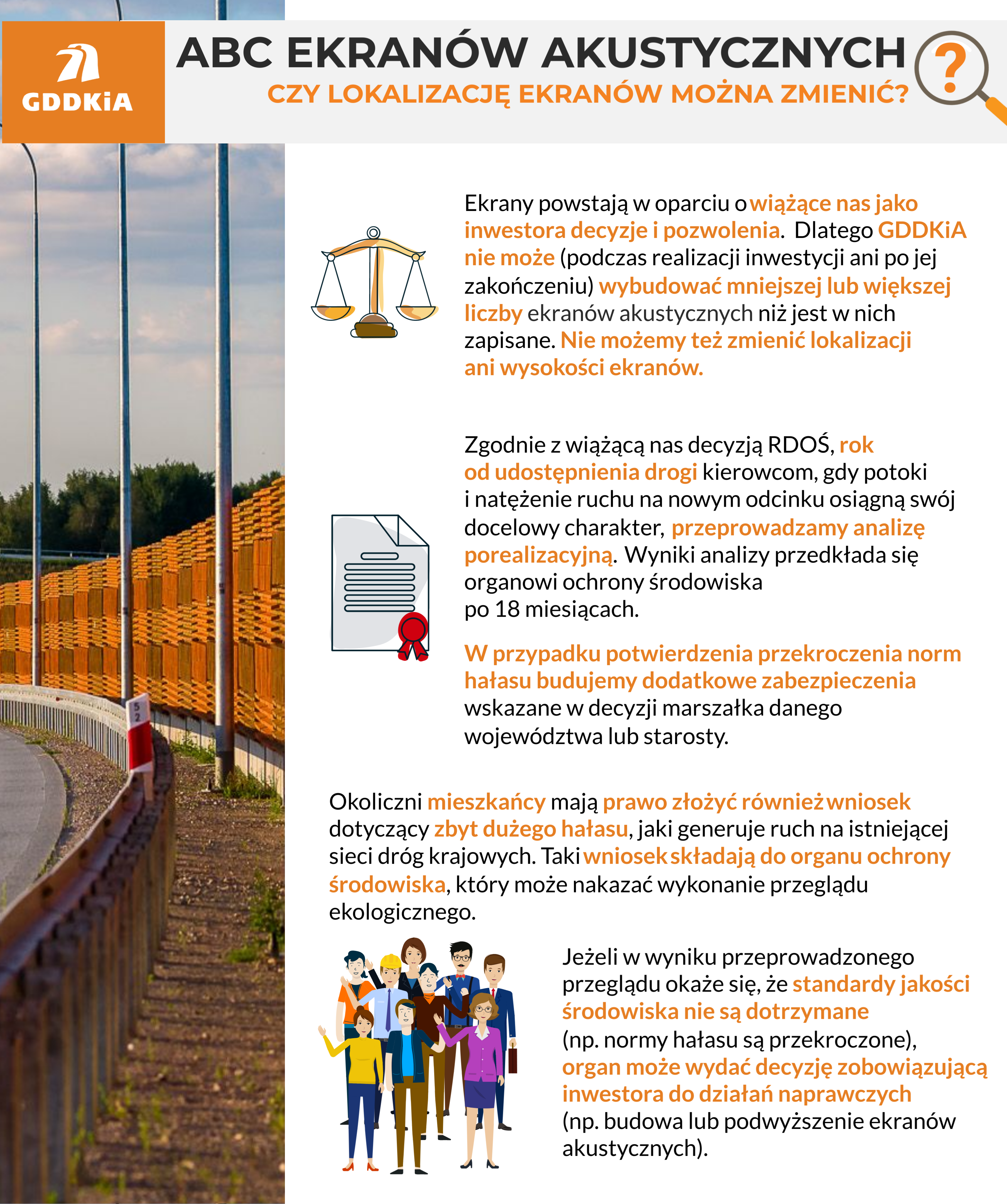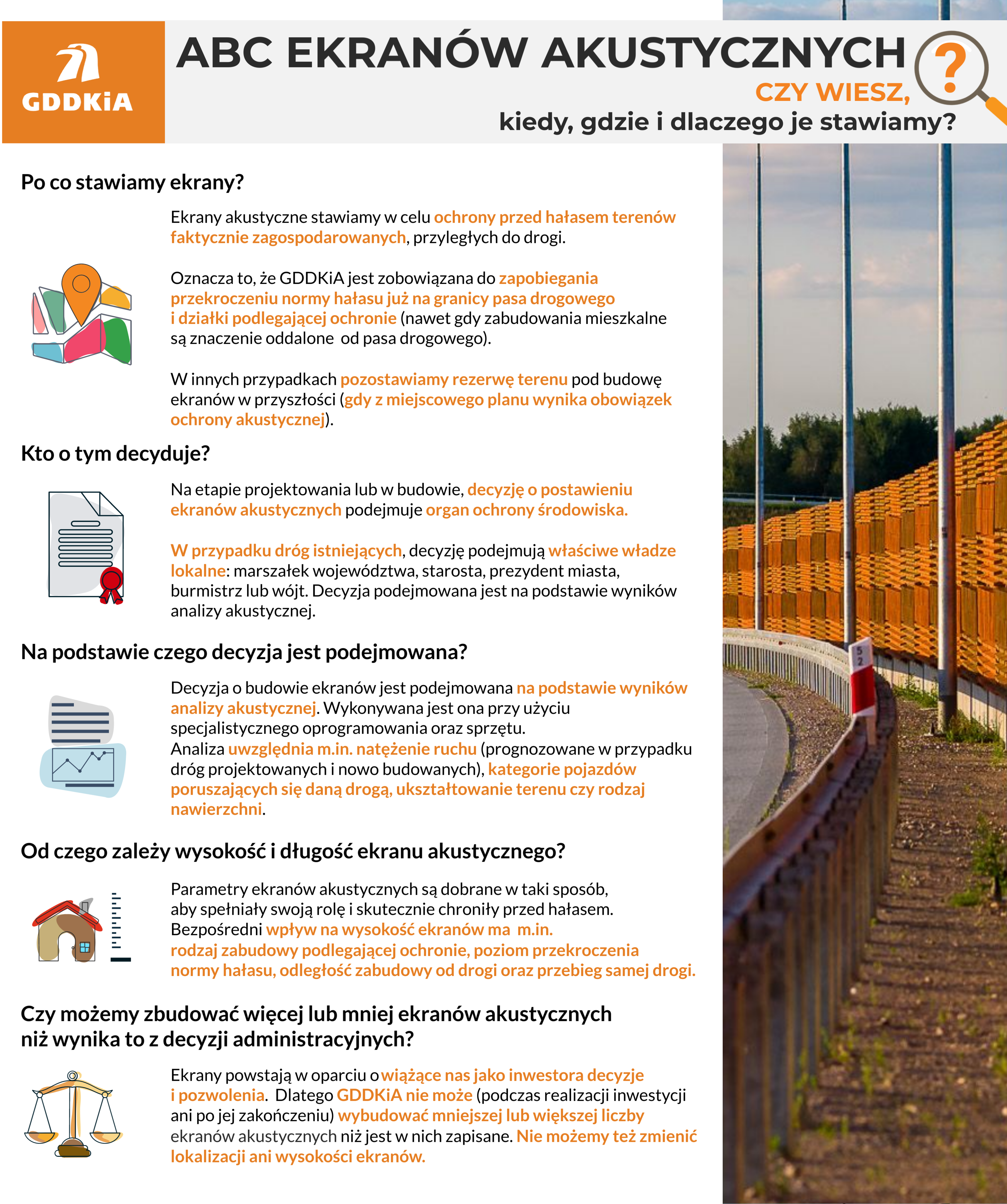 Generalna Dyrekcja Dróg Krajowych i Autostrad realizuje inwestycje drogowe zgodnie z obowiązującymi przepisami. Dotyczy to wszystkich elementów infrastruktury, także ekranów akustycznych. Poniżej przypominamy, kiedy, gdzie i dlaczego je stawiamy.