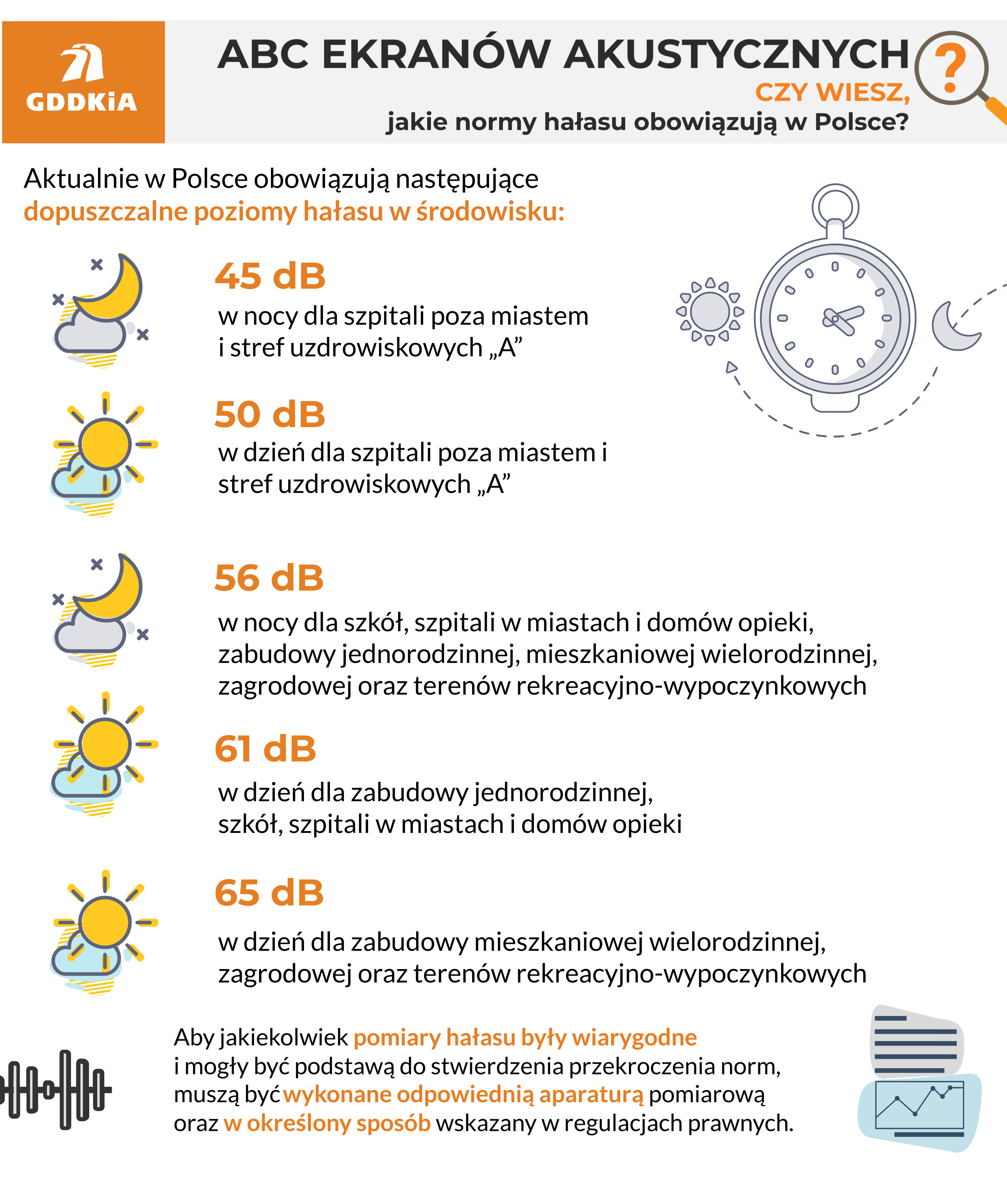 Działamy zgodnie z przepisami prawa i uzyskanymi decyzjami właściwych organów. Kierujemy się rozporządzeniem w sprawie dopuszczalnych poziomów hałasu w środowisku, ustawą o udostępnianiu informacji o środowisku i jego ochronie, udziale społeczeństwa w ochronie środowiska oraz o ocenach oddziaływania na środowisko, ustawą Prawo ochrony środowiska a także zapisami miejscowych planów zagospodarowania przestrzennego. To na podstawie ww. przepisów i dokumentów, aktualnych na dzień uzyskiwania decyzji o pozwoleniu na realizację inwestycji drogowej, lokalizowane i budowane są ekrany akustyczne. Dodatkowe mogą powstać po zbudowaniu drogi, jeśli normy hałasu będą przekroczone i właściwy marszałek województwa lub starosta wyda stosowną decyzję. Przypomnijmy, że od 1 października 2012 r. obowiązują nowe dopuszczalne poziomy hałasu w środowisku, a od 9 czerwca 2022 r. do polskich przepisów zaimplementowano dyrektywy unijne w sprawie wspólnych metod oceny hałasu oraz metod oceny szkodliwych skutków hałasu w środowisku.