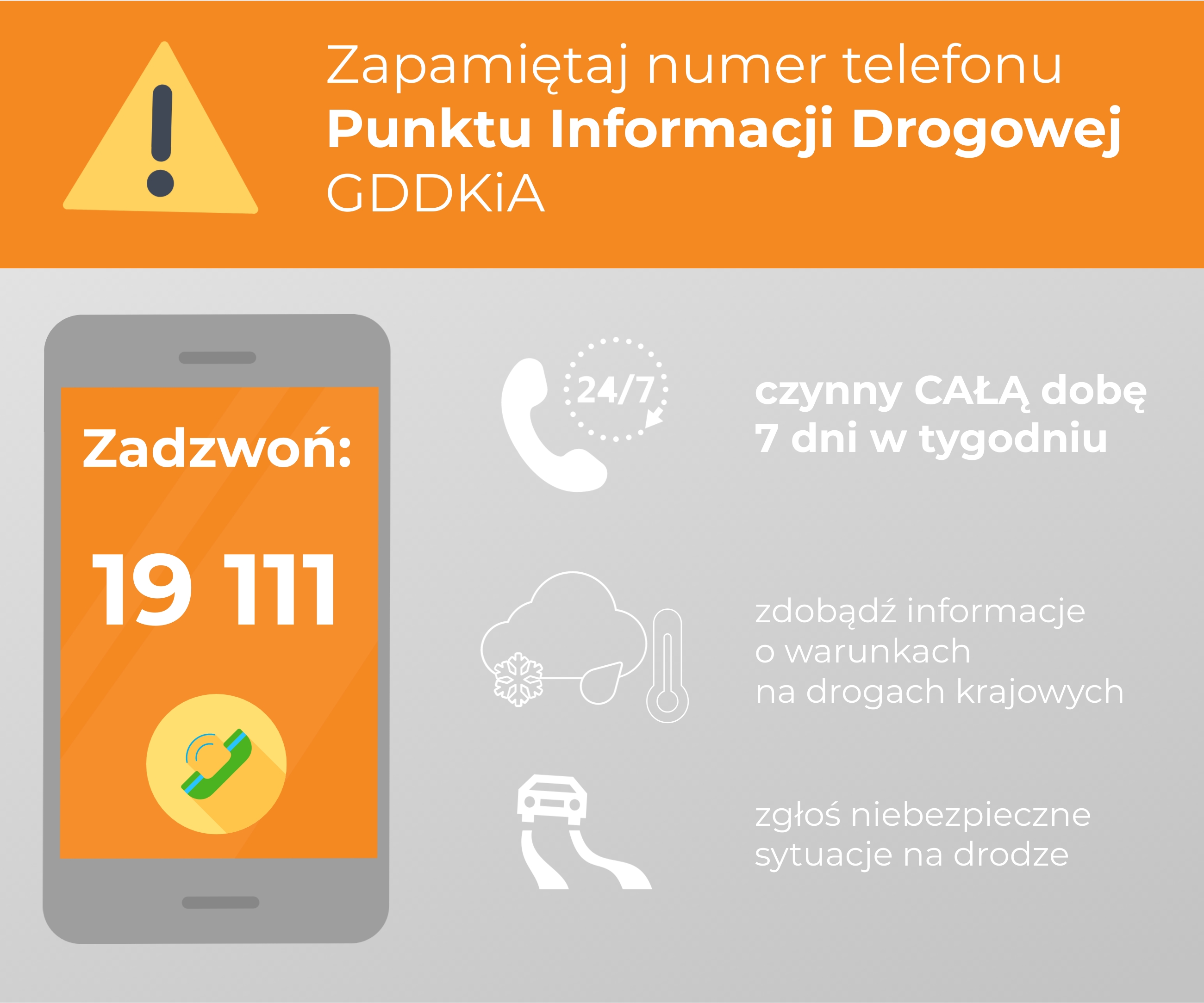 Numer Informacji Drogowej 19 111 służy użytkownikom dróg już od dekady. Przez całą dobę, siedem dni w tygodniu dostępni pod nim pracownicy GDDKiA, którzy dostarczają informacji o warunkach panujących na zarządzanych przez nas drogach krajowych. Numer obsługiwany jest przez nasze Punkty Informacji Drogowej (PID), które zbierają dane o sytuacji na drogach i przekazują je użytkownikom oraz środkom masowego przekazu.