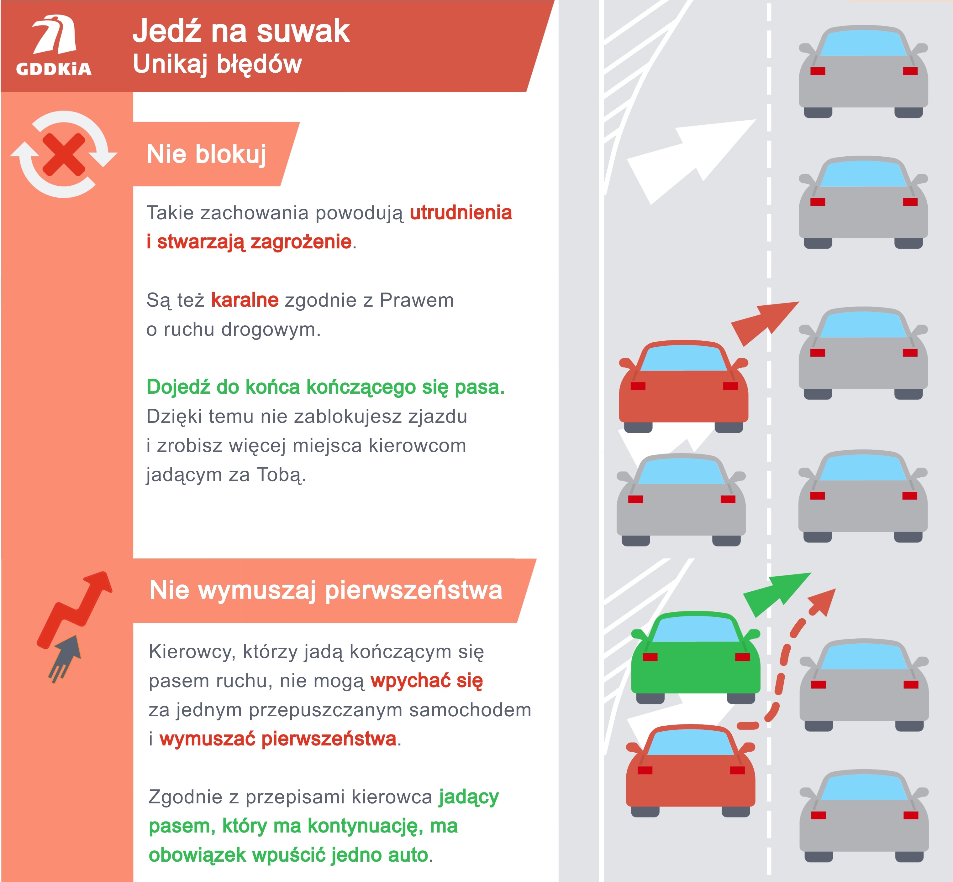 Jazdę na suwak stosuj w przypadku kończącego się jednego lub więcej pasów ruchu i tylko w sytuacji dużego natężenia ruchu oraz zatorów drogowych, potocznie zwanych korkami. W tym celu: