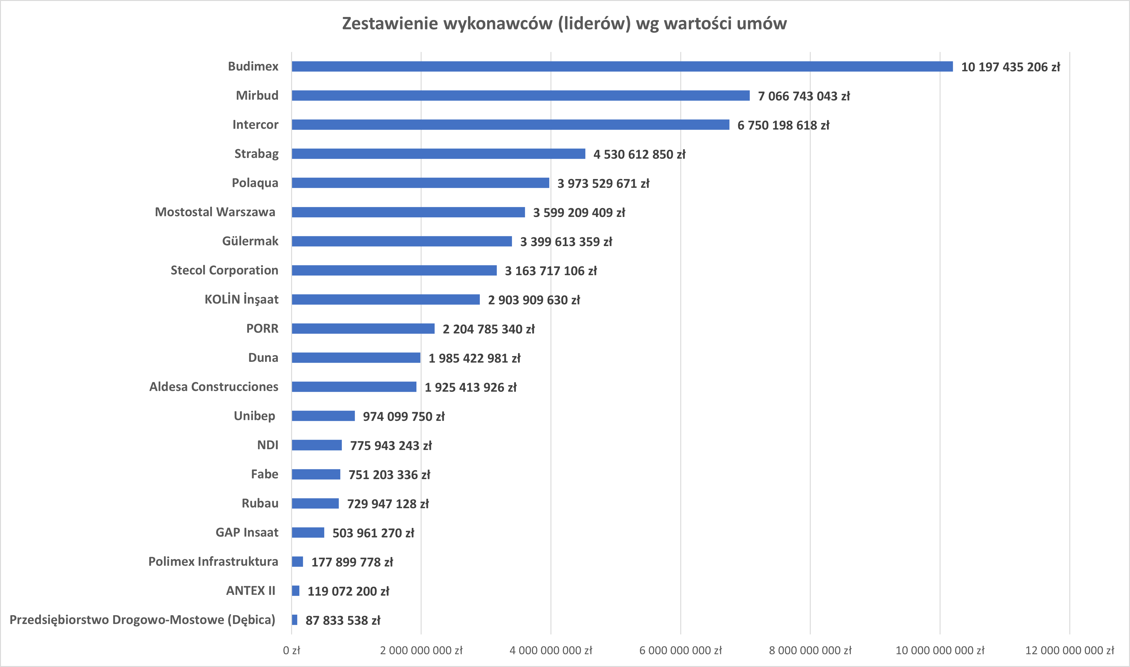 Intercor zajął samodzielnie trzecie miejsce w zestawieniu długości realizowanych odcinków (blisko 157 km) oraz wartości (ponad 6,7 mld zł). Strabag jest czwarty pod względem długości odcinków (ponad 136 km) i ich wartości (przekracza 4,5 mld zł). Szczegółowe zestawienie wykonawców kluczowych inwestycji na drogach krajowych zobaczyć można na załączonych grafikach.