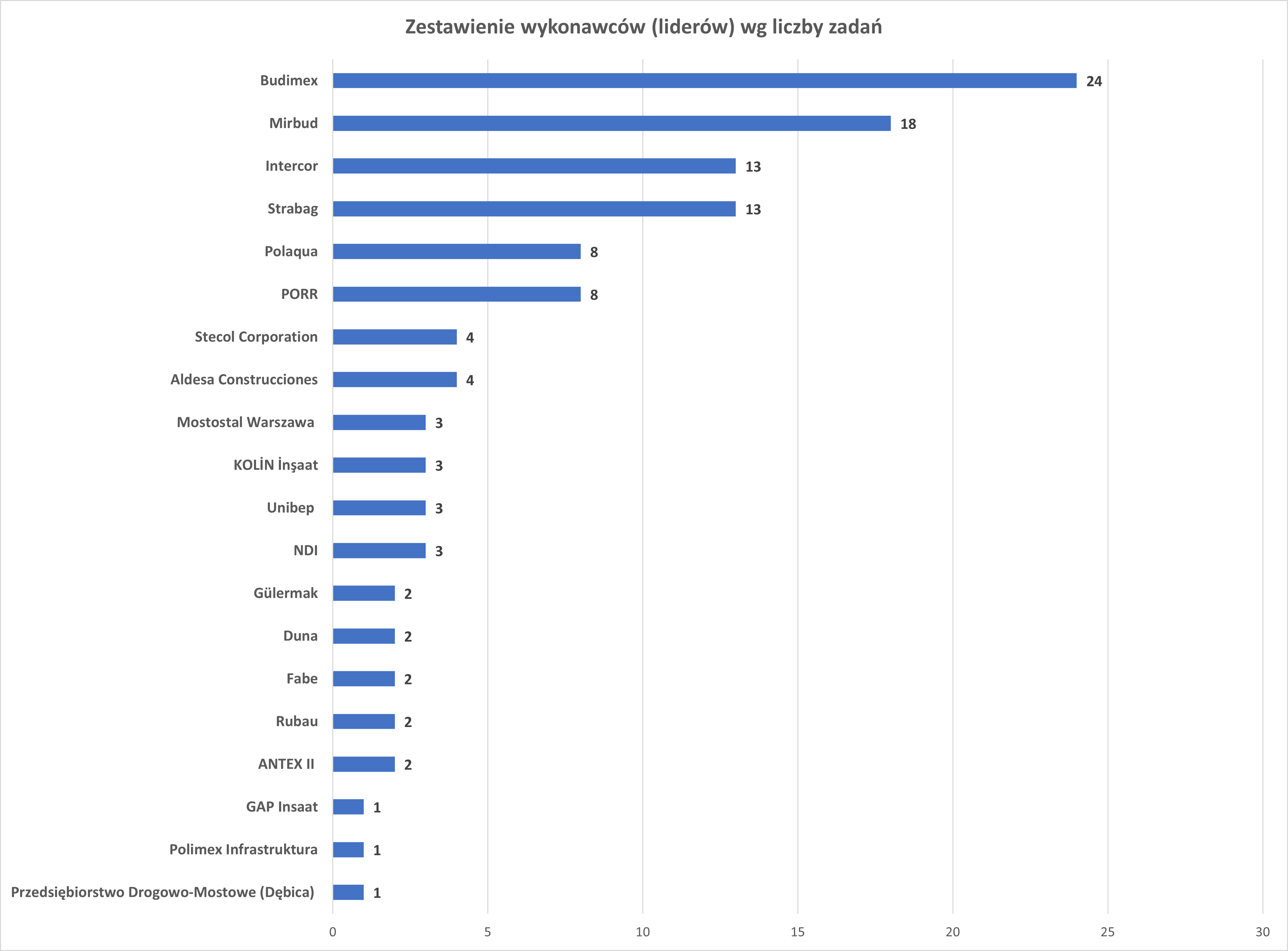 Budimex, Mirbud oraz Intercor – to właśnie te firmy zajmują w naszych rankingach trzy pierwsze miejsca, niezależnie od tego, czy pod uwagę bierzemy liczbę odcinków realizacyjnych, ich długość czy wartość podpisanych umów. Wśród wykonawców z największą liczbą zadań, trzecią pozycję – ex aequo z Intercorem – zajmuje też Strabag.