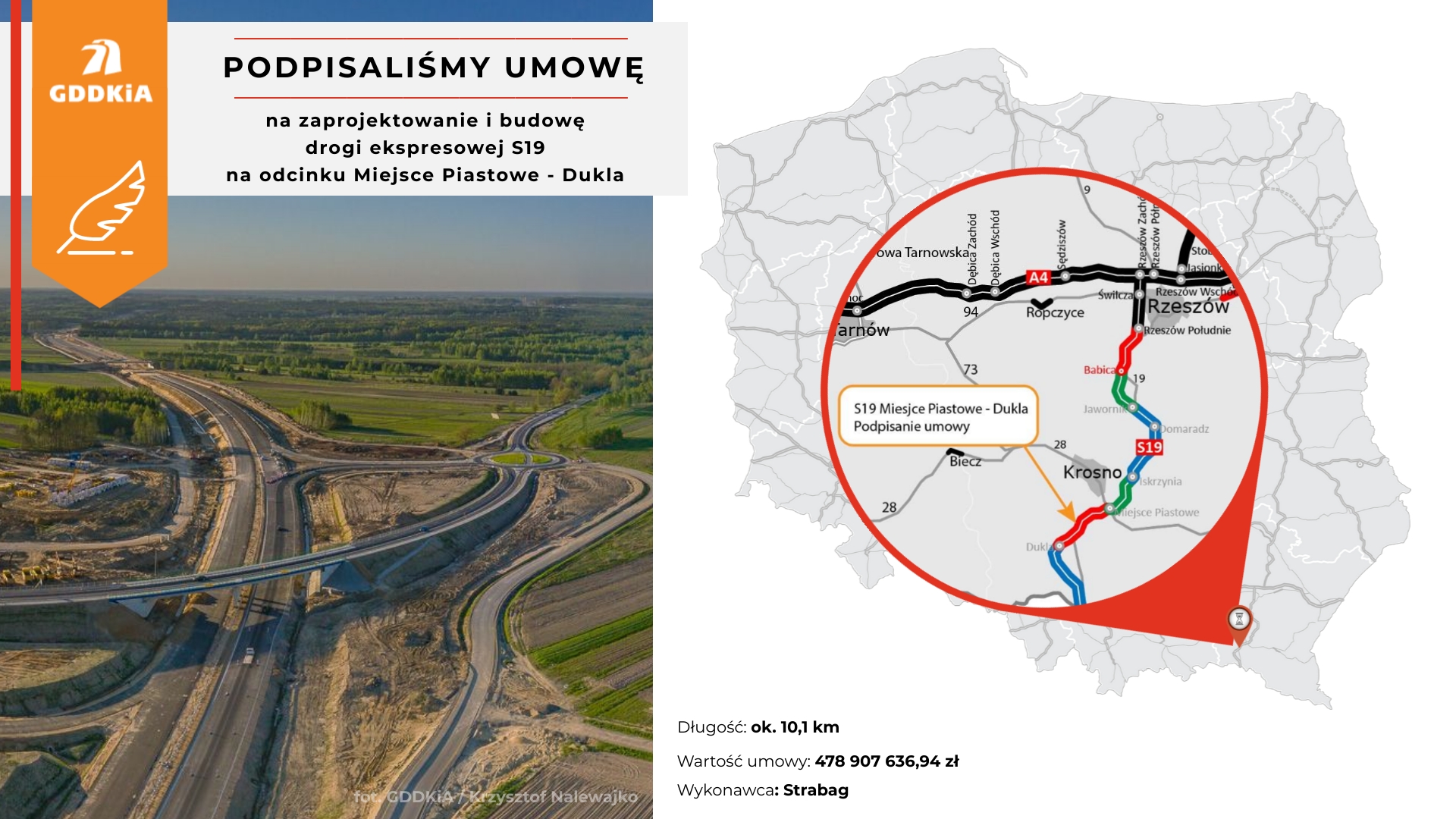 Umowa przewiduje opracowanie projektu i budowę odcinka drogi ekspresowej S19 o długości ok. 10,1 km. Wykonawcą prac jest firma Strabag. Wartość umowy wynosi 478 907 636,94 zł.