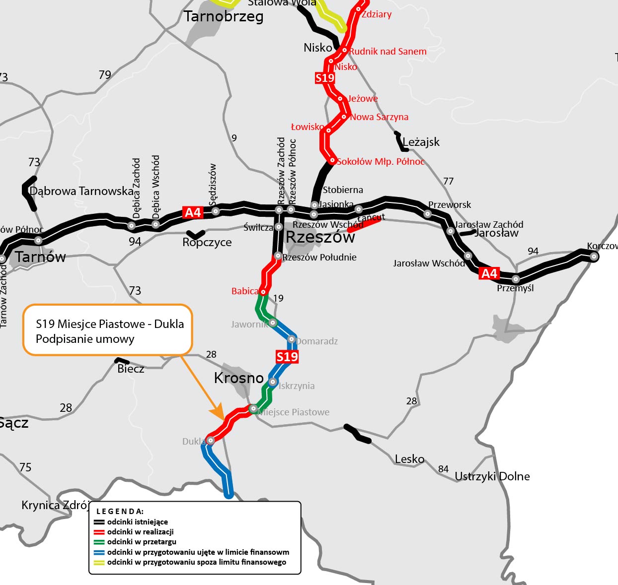 Droga ekspresowa S19 to element międzynarodowego szlaku Via Carpatia, łączącego Europę Północną i Południową. W Polsce trasa ta będzie miała ponad 700 km długości i przebiegać będzie przez województwa podlaskie, warmińsko-mazurskie, mazowieckie, lubelskie i podkarpackie. Na Podkarpaciu będzie miała docelowo długość ok. 169 km. Stan jej realizacji przedstawia się następująco: