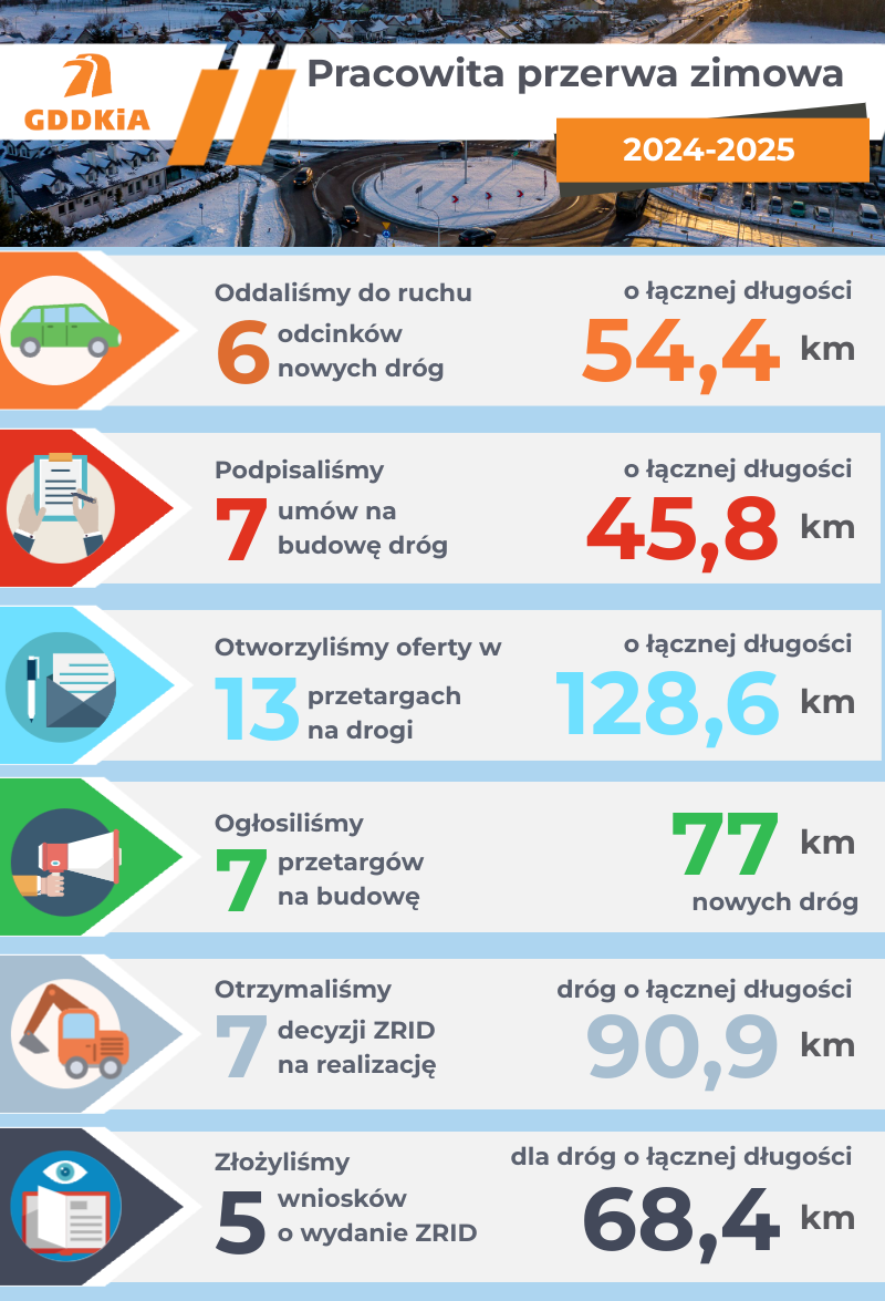 - podpisaliśmy siedem umów na realizację zadań (RPBDK, PB100) o łącznej długości 45,8 km i wartości przekraczającej 1,6 mld zł. Są to dwa odcinki dróg ekspresowych – S8 między Niemczą a Ząbkowicami Śląskimi oraz S10 między węzłami Szczecin Kijewo a Szczecin Zdunowo, a także pięć obwodnic: Pradeł (DK78), Głogowa (DK12), Kamienia Krajeńskiego i Sępólna Krajeńskiego (obie DK25) oraz Srocka (DK12/91),