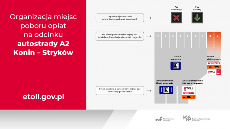 - Na odcinku A2 Konin-Stryków pierwszy skrajny pas ruchu na stacjach poboru opłat (SPO) lub dwa skrajne pasy ruchu na placach poboru opłat (PPO), licząc od prawej strony oznaczone tablicą ze znakiem e-TOLL.