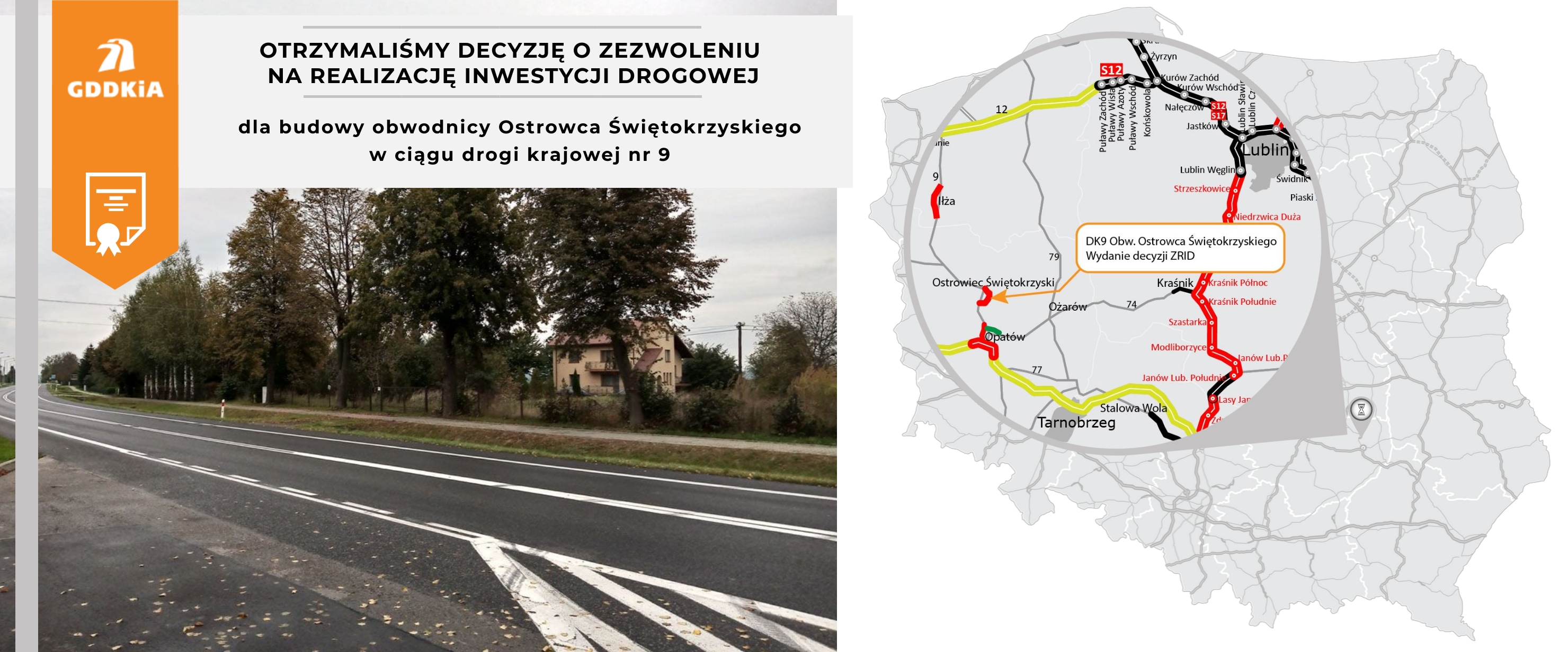 Wojewoda Świętokrzyski wydał decyzję o zezwoleniu na realizację inwestycji drogowej dla obwodnicy Ostrowca Świętokrzyskiego w ciągu drogi krajowej nr 9. Inwestycja jest realizowana od ubiegłego roku w systemie Projektuj i buduj w ramach rządowego Programu Budowy Dróg Krajowych.