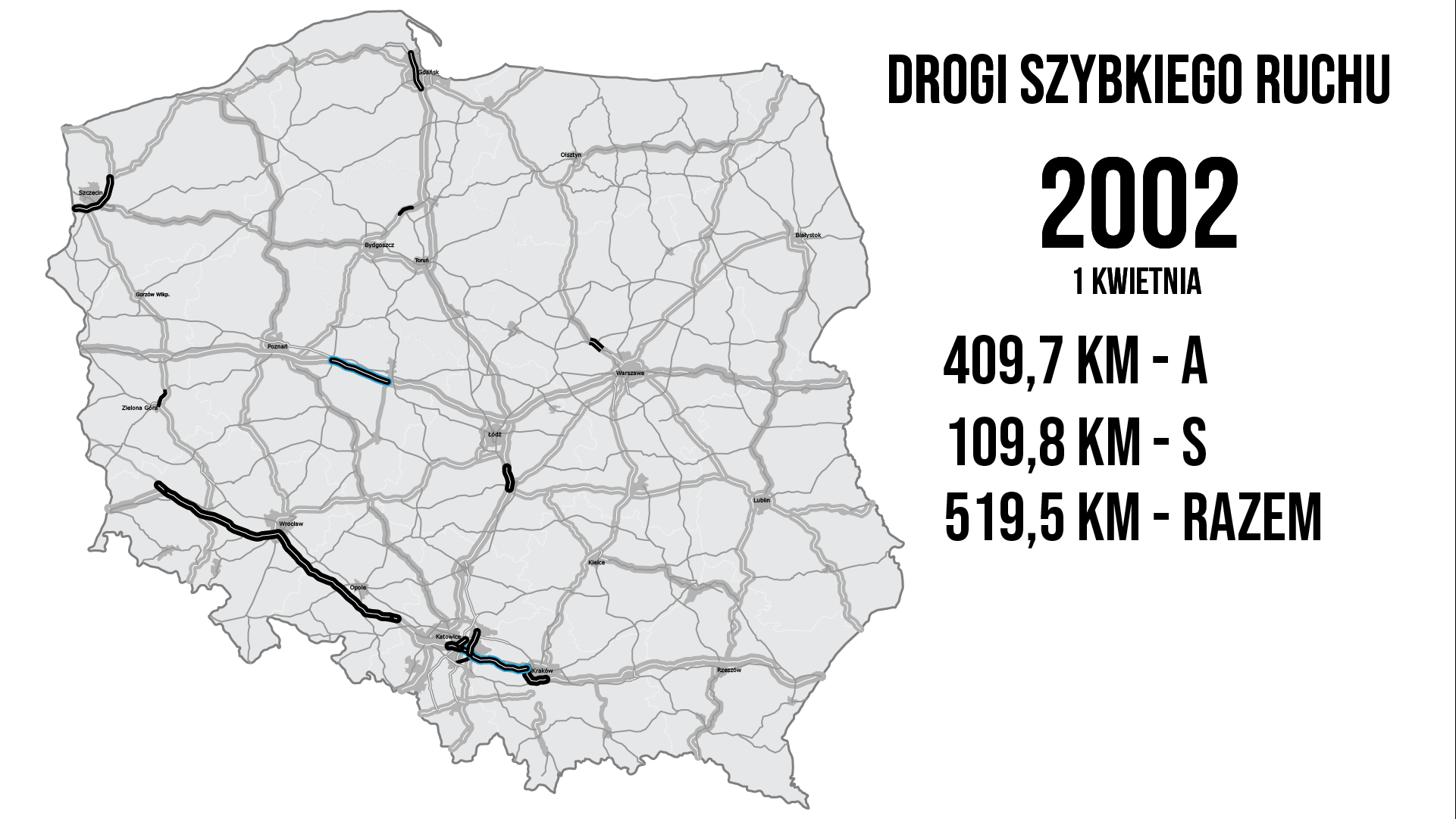Od 1 kwietnia 2002 r. ich przygotowanie i realizację przejęła GDDKiA. Nowy organ administracji rządowej odpowiada również za przygotowanie, budowę i przebudowę oraz utrzymanie sieci dróg krajowych. W tym okresie w Polsce było ok. 410 km autostrad (w tym ok. 108 km koncesyjnych) i ok. 110 kilometrów dróg ekspresowych, łącznie blisko 520 km dróg szybkiego ruchu.