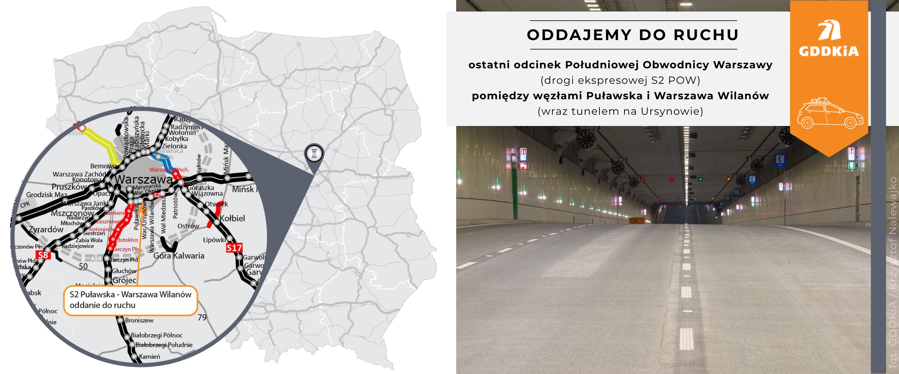 Od dziś kierowcy mogą korzystać z 4,6-kilometrowego odcinka drogi ekspresowej S2 pomiędzy węzłami Puławska i Warszawa Wilanów wraz z tunelem pod Ursynowem. To ostatni zrealizowany fragment trasy S2 Południowej Obwodnicy Warszawy, której długość obecnie wynosi ok. 33 km. Inwestycja ta jest ważna nie tylko dla mieszkańców Warszawy, ułatwiając komunikację między dzielnicami. To przede wszystkim uzupełnienie ciągu dla kierowców przemieszczających się tranzytem na osi wschód-zachód autostradą A2.