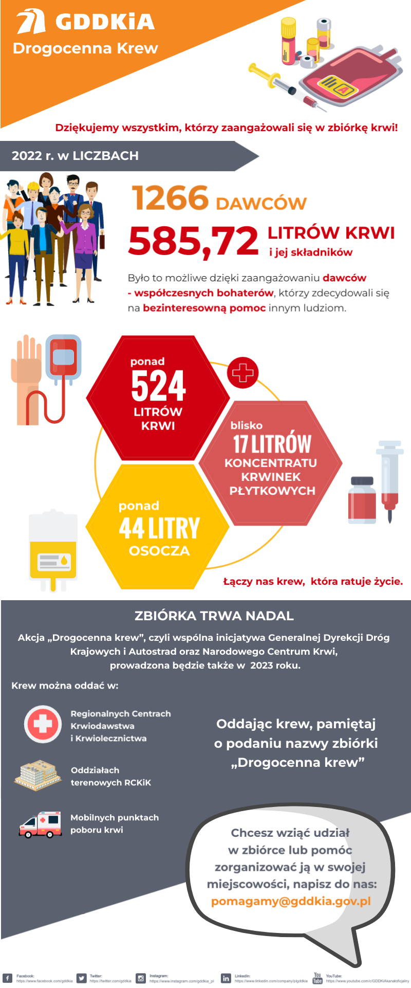Akcja „Drogocenna krew”, czyli wspólna inicjatywa Generalnej Dyrekcji Dróg Krajowych i Autostrad oraz Narodowego Centrum Krwi, prowadzona będzie także w 2023 roku. Krew można oddawać w Regionalnych Centrach Krwiodawstwa i Krwiolecznictwa, oddziałach terenowych RCKiK oraz mobilnych punktach poboru krwi. Oddając krew, pamiętajmy o podaniu przy rejestracji nazwy zbiórki „Drogocenna krew”.