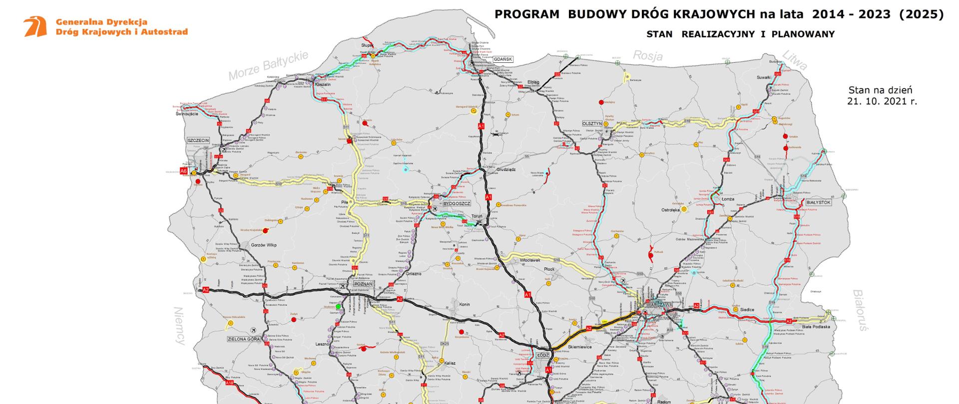 W realizacji w systemie tradycyjnym (wykonawca realizuje prace w terenie) oraz Projektuj i buduj (wykonawca opracowuje potrzebną dokumentację, składa wniosek o wydanie decyzji o zezwoleniu na realizację inwestycji drogowej, a po jej otrzymaniu rozpoczyna prace w terenie). Obecnie w realizacji mamy 112 zadań o łącznej długości 1494,9 km z rządowego Programu Budowy Dróg Krajowych (PBDK) oraz 13 zadań o łącznej długości 106,9 km z rządowego Programu budowy 100 obwodnic (PB100).