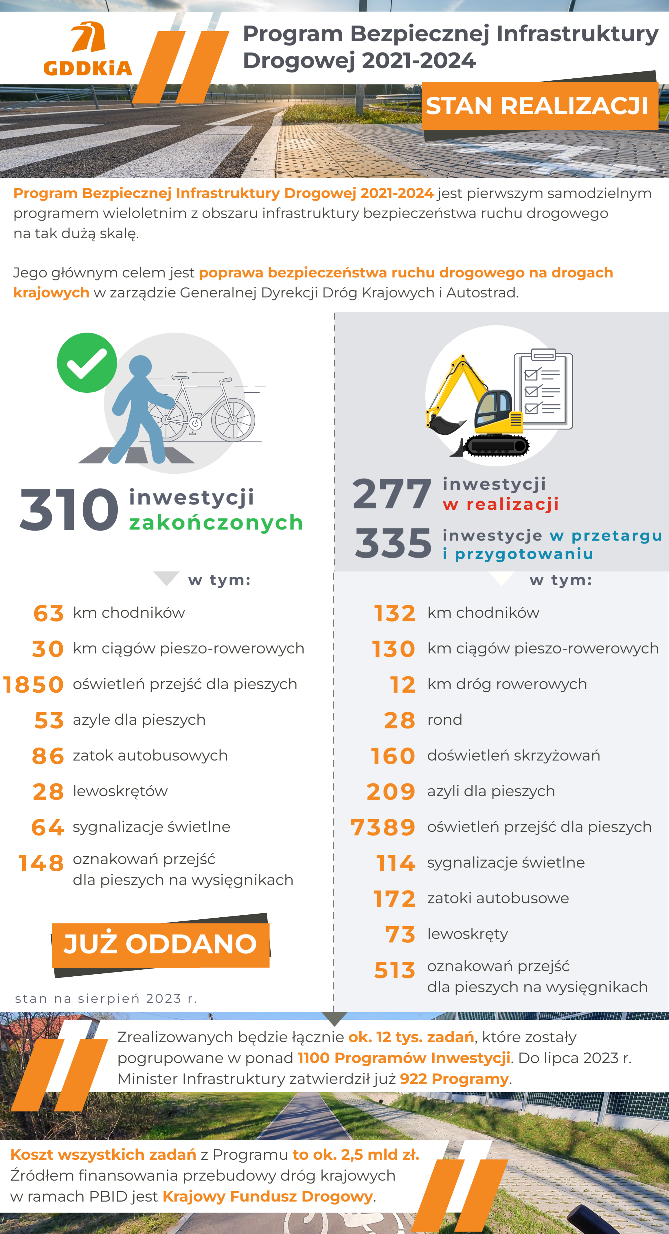 Do końca lipca br. w ramach PBID powstało m.in. ponad 63 km chodników, 30 km ciągów pieszo-rowerowych oraz 1850 dedykowanych oświetleń przejść dla pieszych. Zbudowane zostały 53 azyle dla pieszych, 86 zatok autobusowych i 28 lewoskrętów. Na przejściach dla pieszych powstały 64 sygnalizacje świetlne oraz 148 znaków D-6 (przejście dla pieszych) na wysięgnikach.