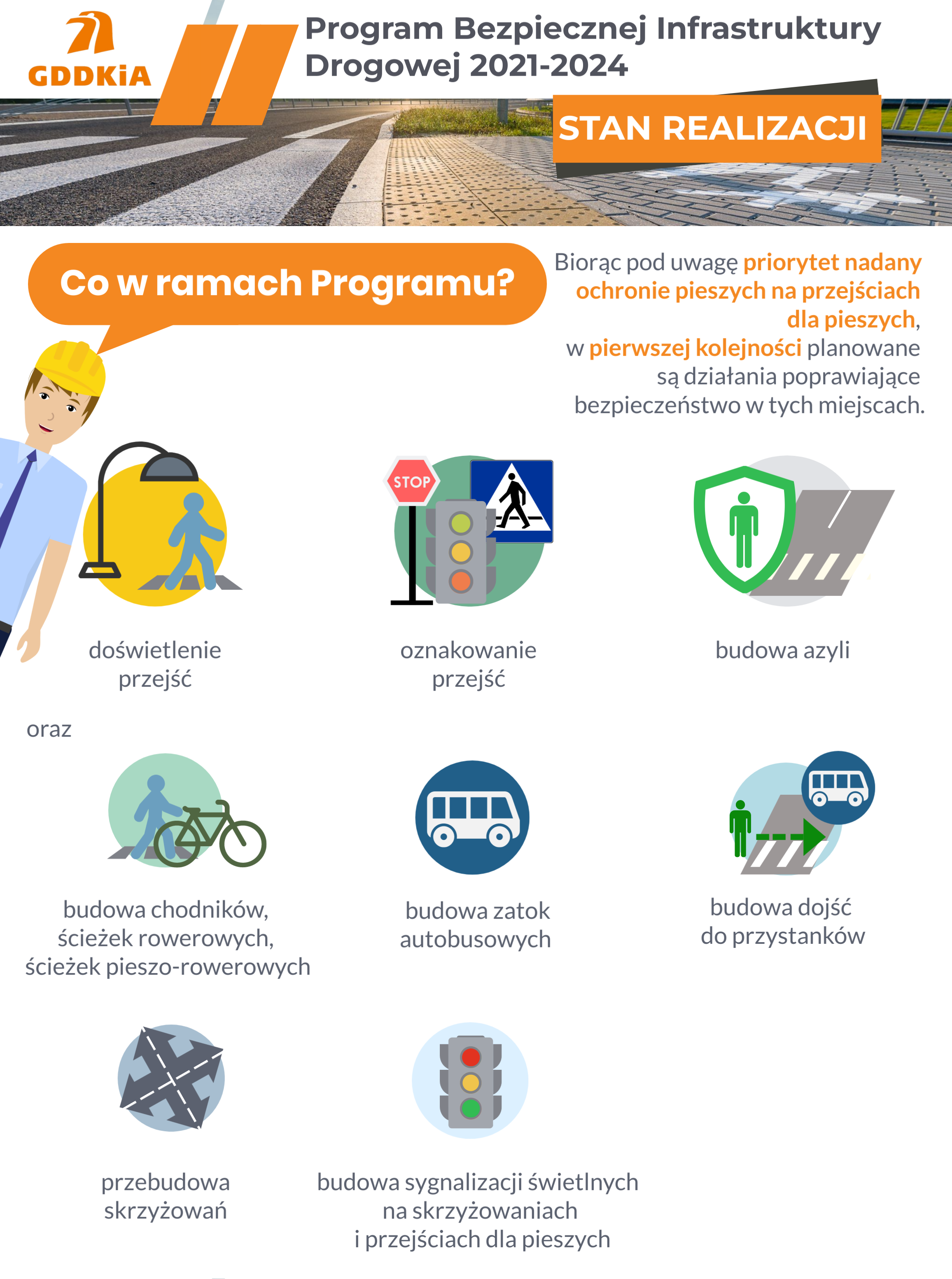 Bezpieczeństwo pieszych poprawimy poprzez budowę 209 azyli, 513 znaków D-6 na wysięgnikach, 7389 oświetleń przejść dla pieszych oraz 114 sygnalizacji na przejściach. Powstaną również 172 zatoki autobusowe oraz 73 lewoskręty.
