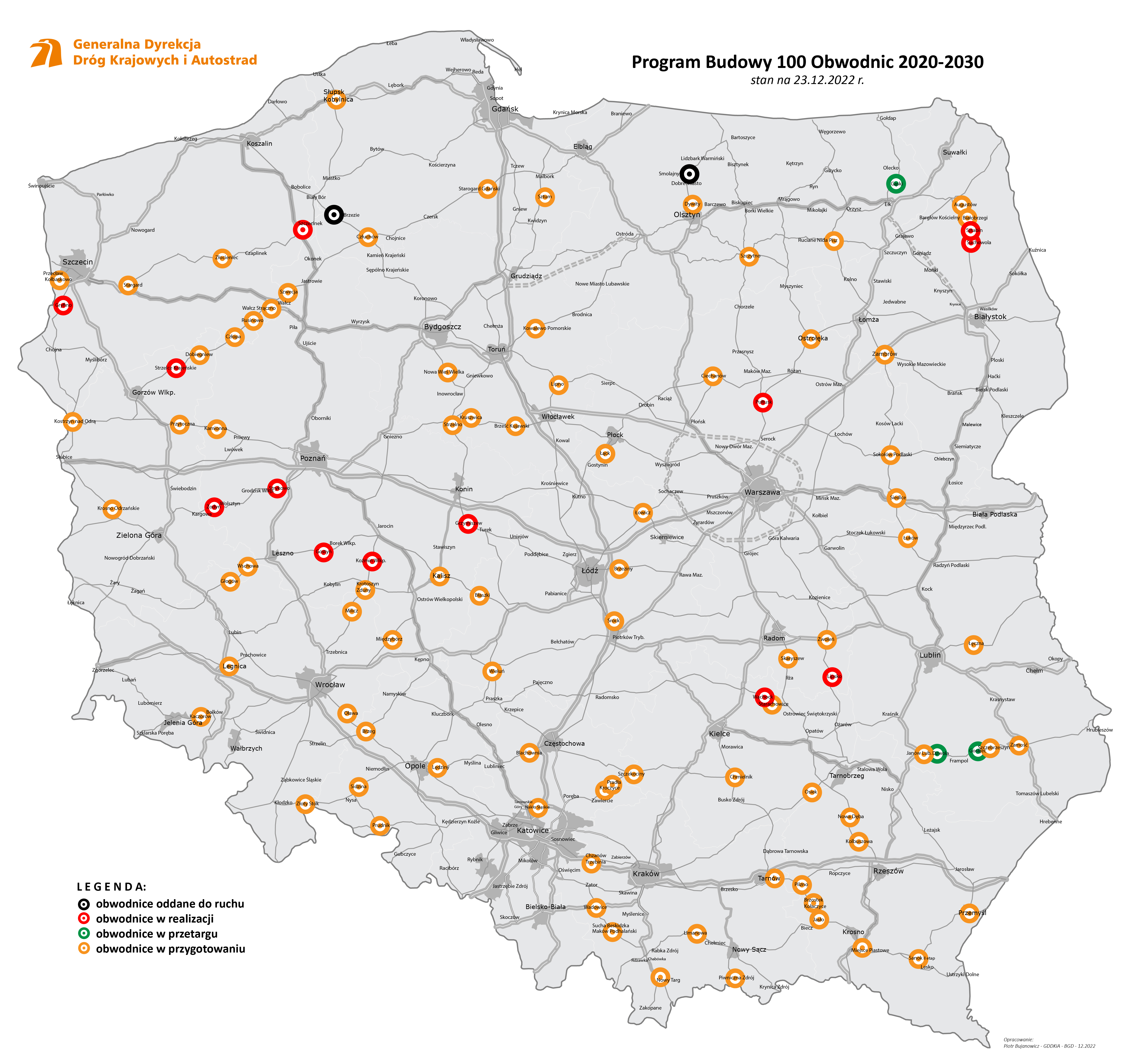 W realizacji jest trzynaście obwodnic o łącznej długości 105,3 km i wartości blisko 2 mld zł. Są to obwodnice: Wąchocka w ciągu DK42 (woj. świętokrzyskie), Koźmina Wielkopolskiego w ciągu DK15, Gostynia w ciągu DK12, Grzymiszewa w ciągu DK72, Strykowa w ciągu DK32, Żodynia w ciągu DK32 (woj. wielkopolskie), Strzelec Krajeńskich w ciągu DK22 (woj. lubuskie), Gryfina w ciągu DK31, Szczecinka w ciągu DK20 (woj. zachodniopomorskie), Lipska w ciągu DK79, Pułtuska w ciągu DK61 (woj. mazowieckie) oraz Suchowoli i Sztabina w ciągu DK8 (woj. podlaskie).