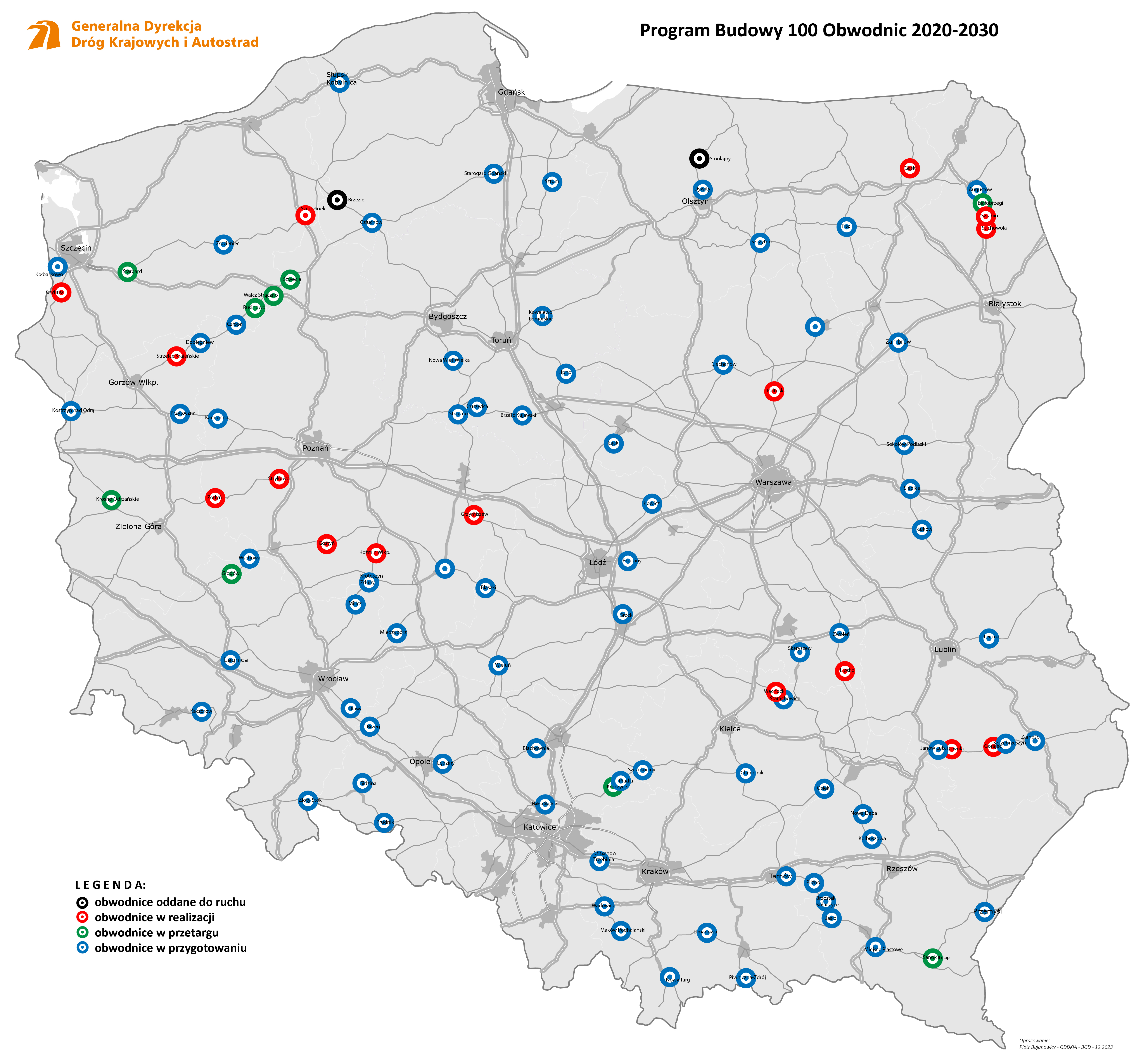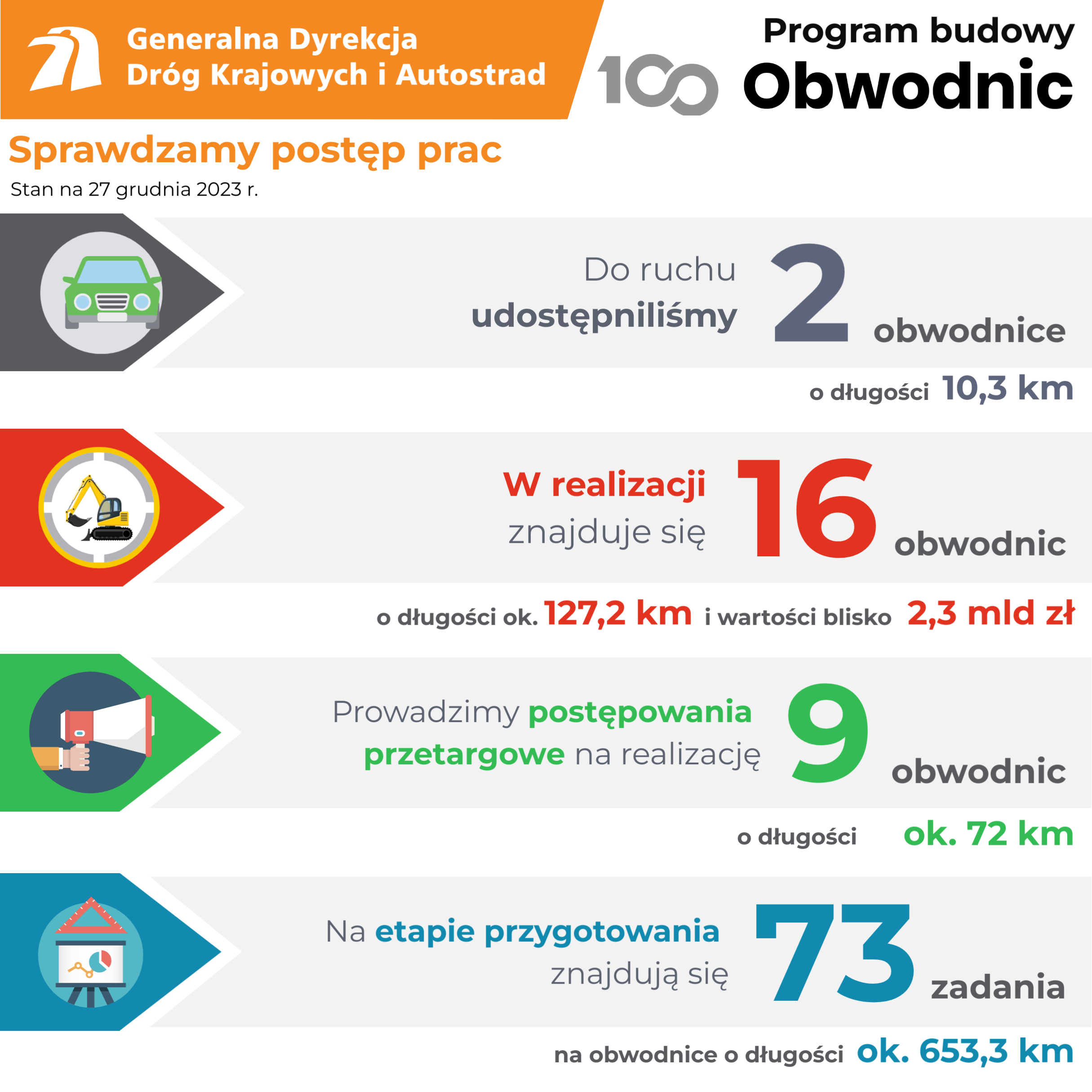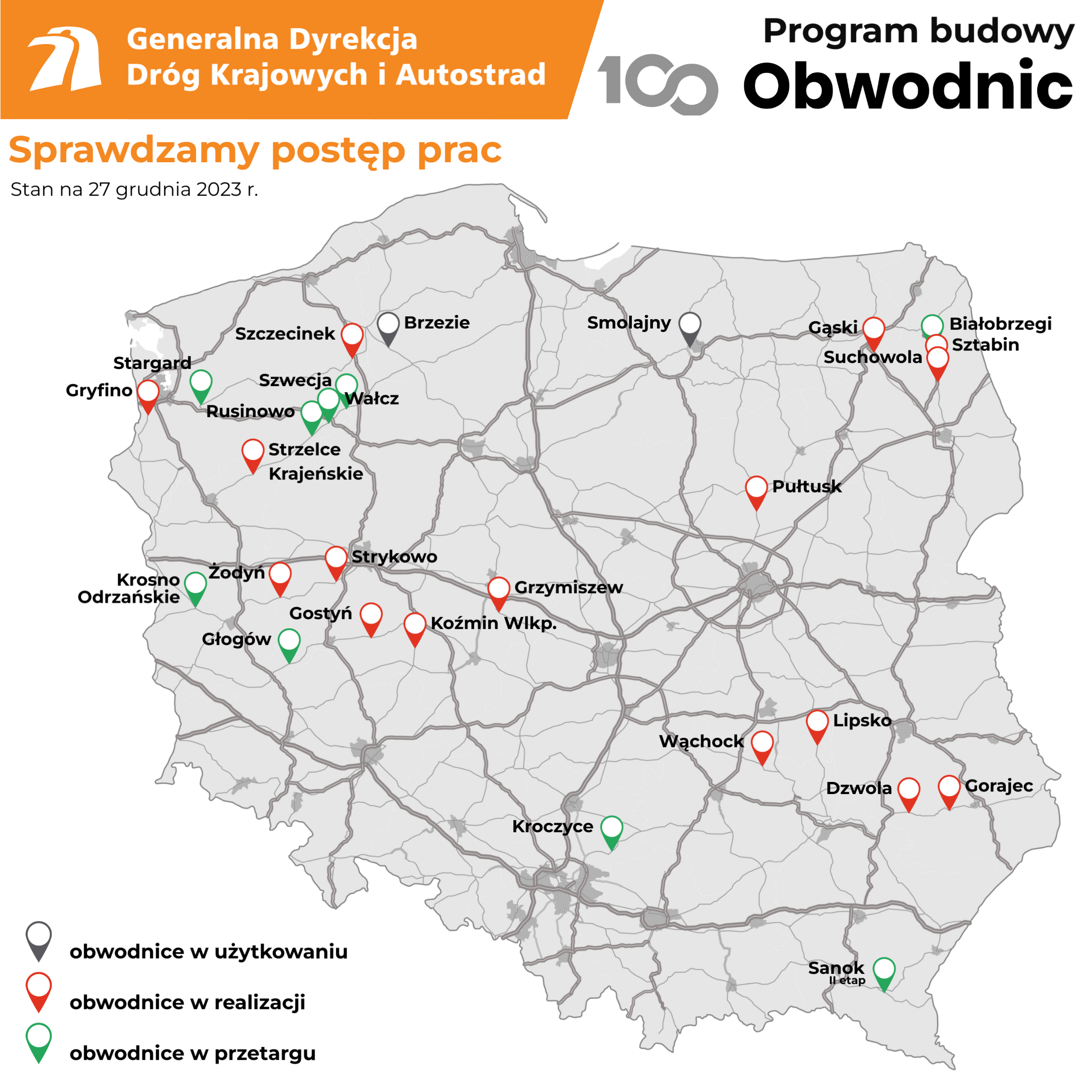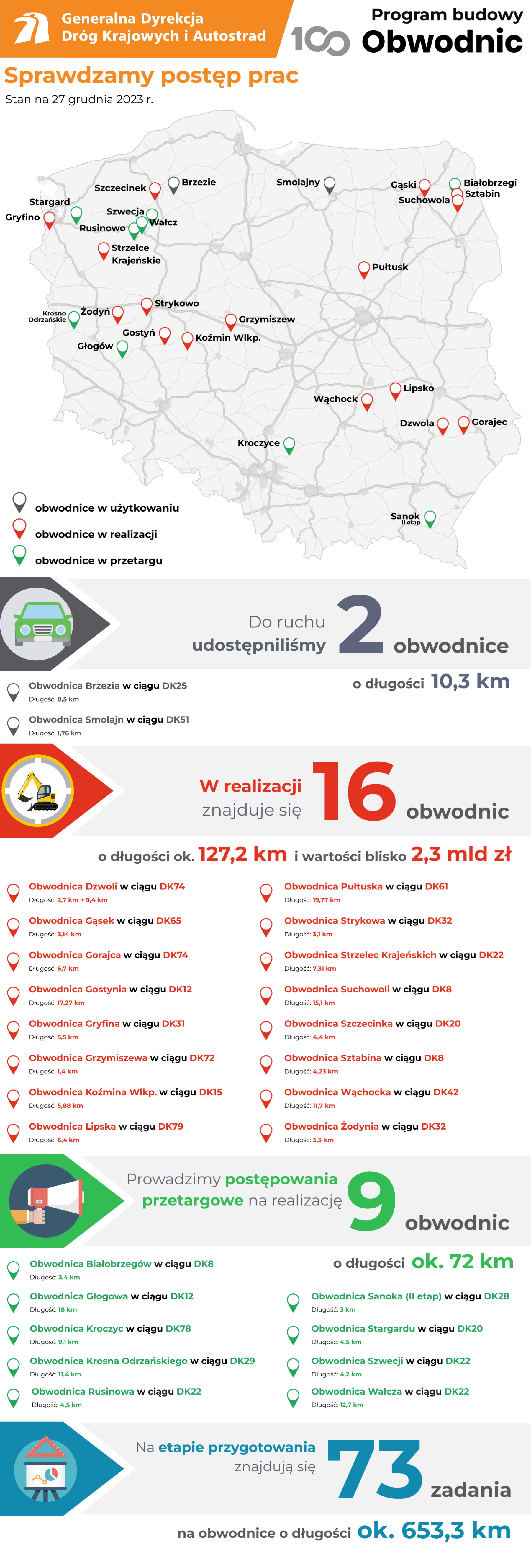 Szesnaście obwodnic jest na etapie realizacji. Dla dziewięciu trwa przetarg na wybór wykonawcy, a kierowcy korzystają z dwóch obwodnic. Jadąc DK51 omijają Smolajny (woj. warmińsko-mazurskie), podróżując DK25 Brzezie (woj. pomorskie). Prowadzimy intensywne prace przygotowawcze dla 73 obwodnic.