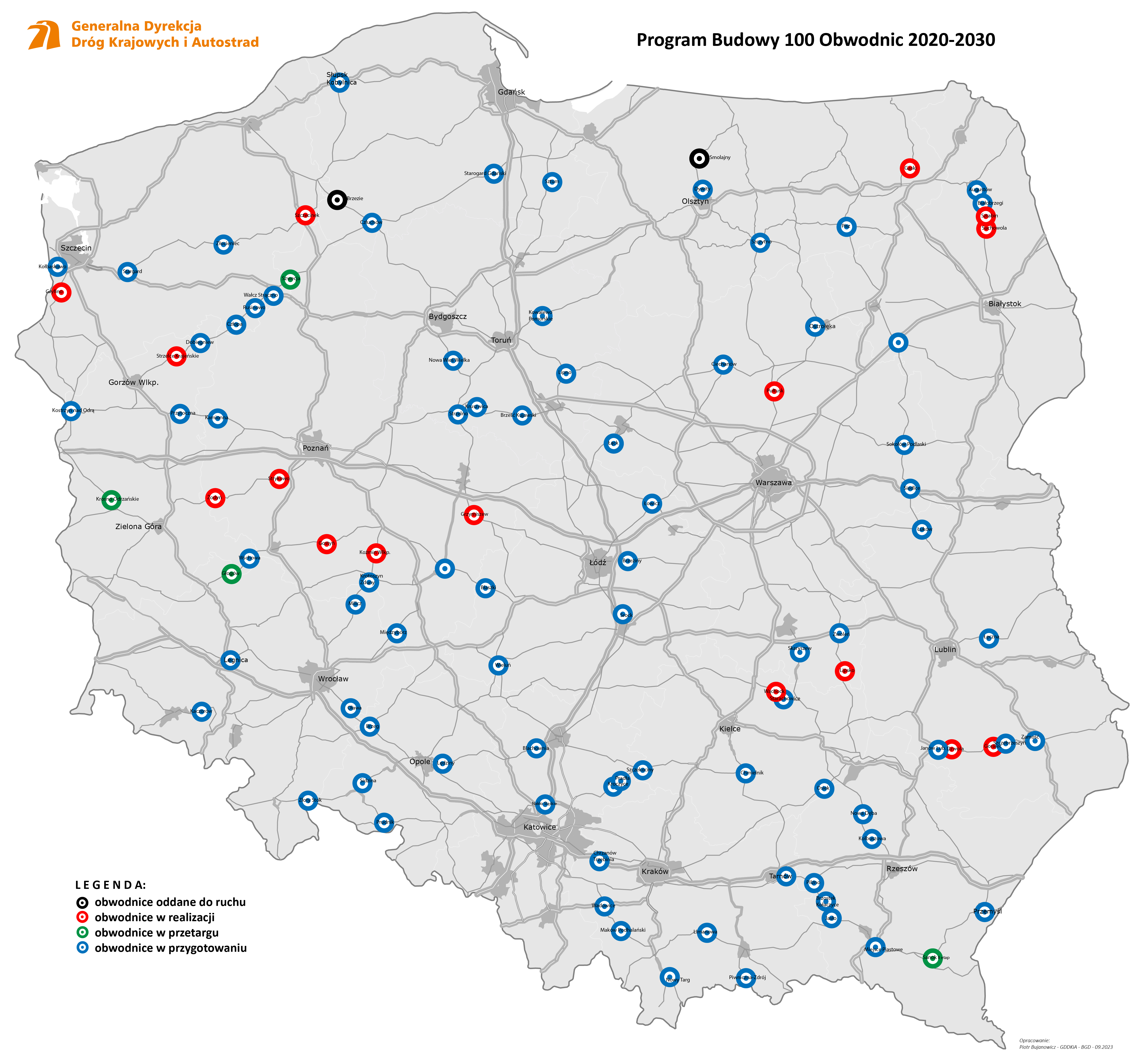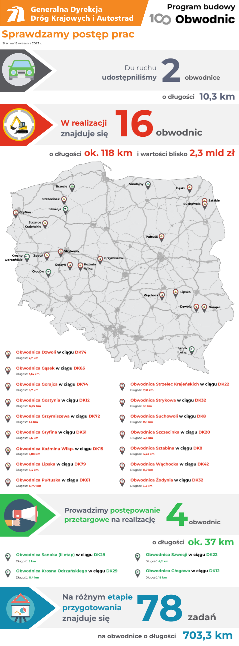 Szesnaście obwodnic jest na etapie realizacji. Dla czterech trwa przetarg na wybór wykonawcy, a kierowcy korzystają z dwóch obwodnic. Jadąc DK51 omijają Smolajny (woj. warmińsko-mazurskie), podróżując DK25 Brzezie (woj. pomorskie). Prowadzimy intensywne prace przygotowawcze dla 78 obwodnic.